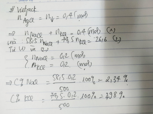 Hòa tan 26,6g hỗn hợp hai muối NaCl , KCl vào nước thành 500g dung dịch A cho dung dịch AgNO3 dư vào dung dịch A thì được 57,4g kết tủa . tính C% của mỗi muối trong dung dịch A