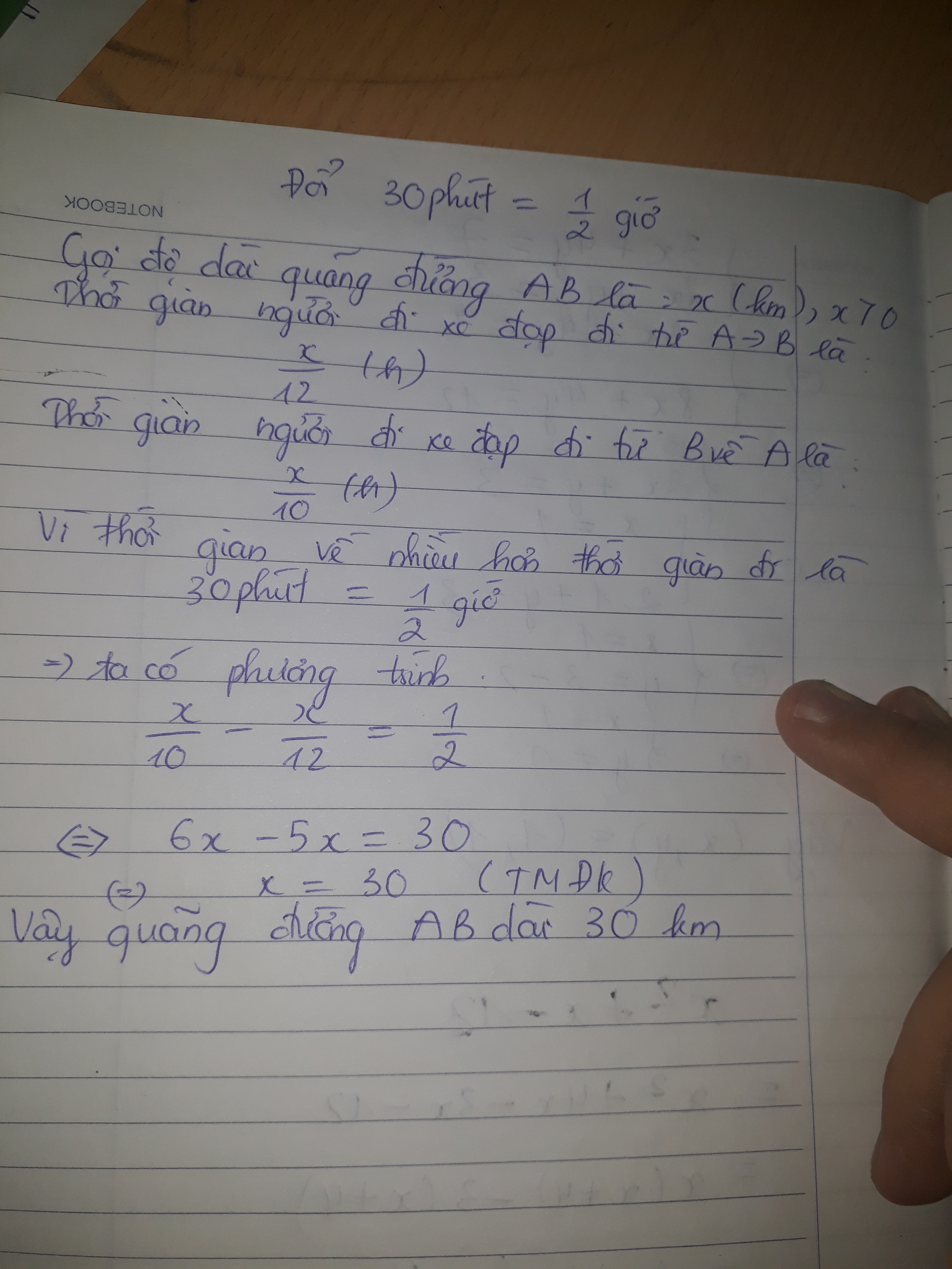 Một người đi xe đạp từ A đến B với vận tốc trung bình 12 km/h . Khi đi từ B về A người đó đi với vận tốc trung bình 10 km/h vì thế thời gian về nhiều hơn thời gian đi là 30 phút .Quãng đường AB dài bao nhiêu km?