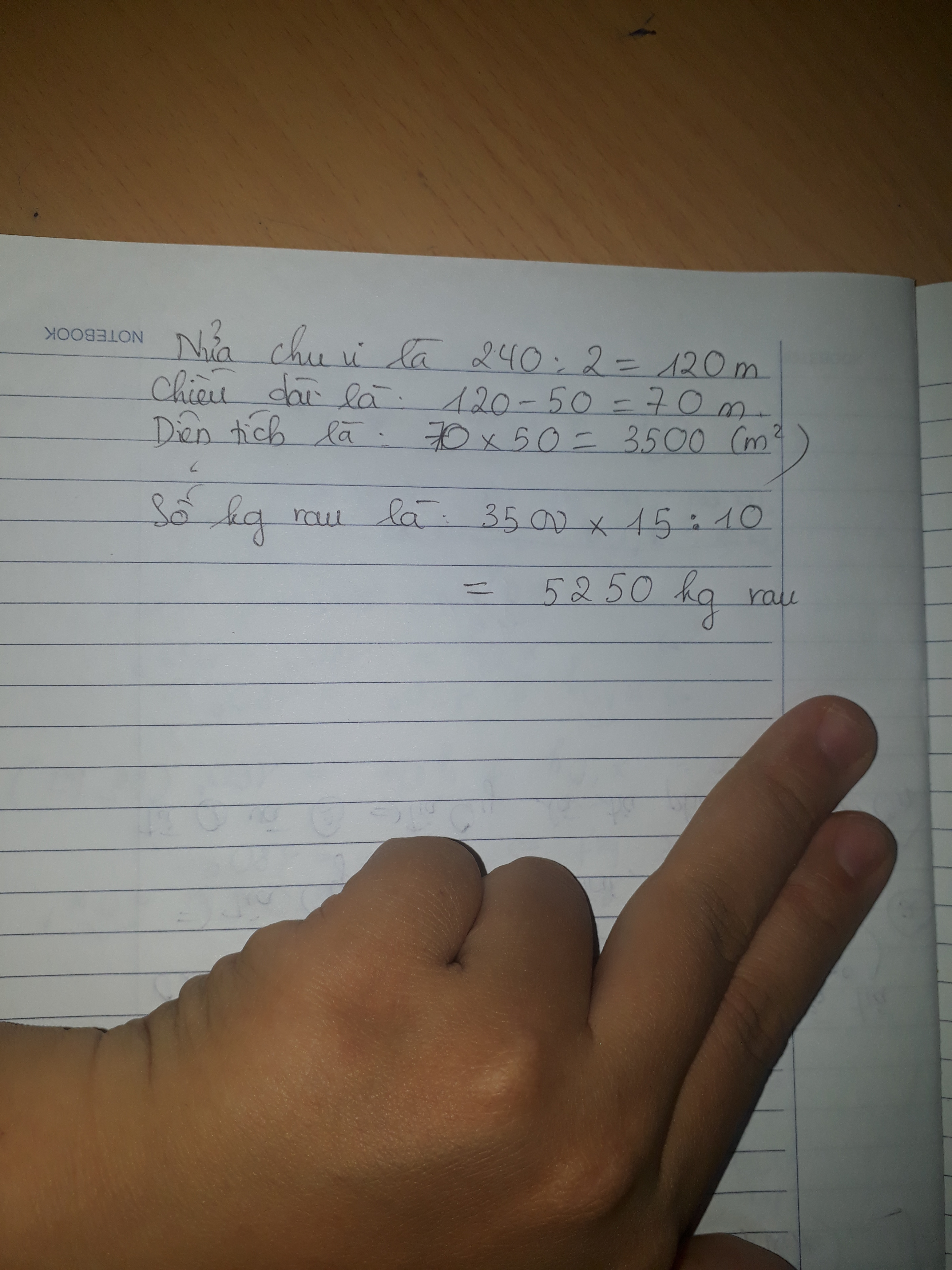 Một mảnh vườn hình chữ nhật có chu vi 240m chiều rộng 50m người ta trồng rau trên mảnh vườn đó trung bình cứ 10 mét vuông thu hoạch được mười lăm kilôgam hỏi trên cả mảnh vườn đó người ta thu hoạch được bao nhiêu kilôgam rau