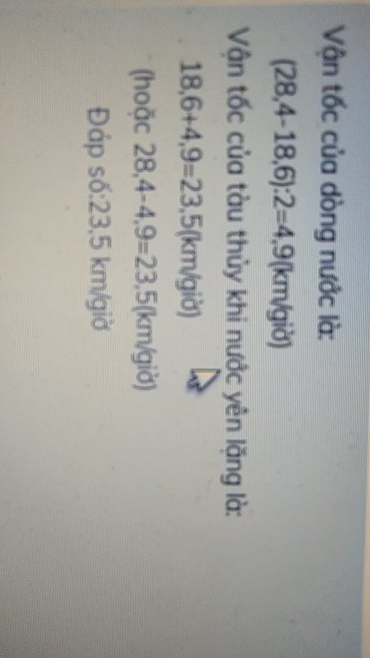 Một tàu thủy khi xuôi dòng có vận tốc 28,4 km trên giờ khi ngược dòng có vận tốc 18,6 km h tính vận tốc của tàu thủy khi nước lặng và vận tốc của dòng nước