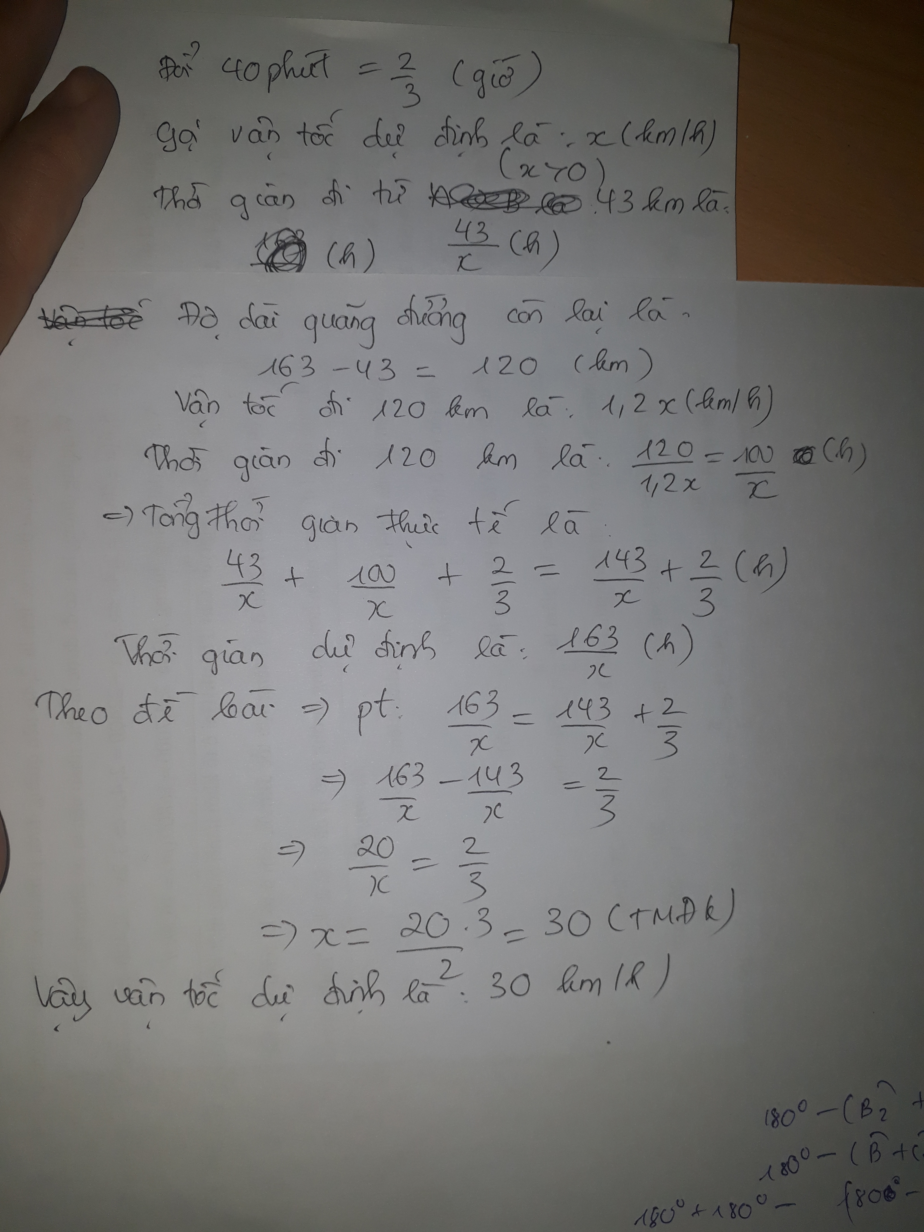 Một ô tô dự định đi từ Lạng Sơn đến Hà Nội với với tốc xác định.Sau khi đi được 43km nó dừng lại 40 phút,để về đến Hà Nội đúng dự định ô tô phải đi với vận tốc bằng 1,2 lần vận tốc cũ trên quãng đường còn lại.Tính vận tốc dự định của ô tô biết quãng đường từ Hà Nội đến Lạng Sơn dài 163km.