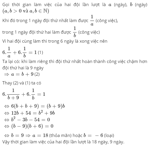 Hai đội công nhân đắp đê ngăn triều cường. Nếu hai đội cùng làm thì trong 6 ngày xong việc. Nếu làm riêng thì đội 1 hoàn thành công việc chậm hơn đội 2 là 9 ngày. Hỏi nếu làm riêng thì mỗi đội đắp xong đê trong bao nhiêu ngày???