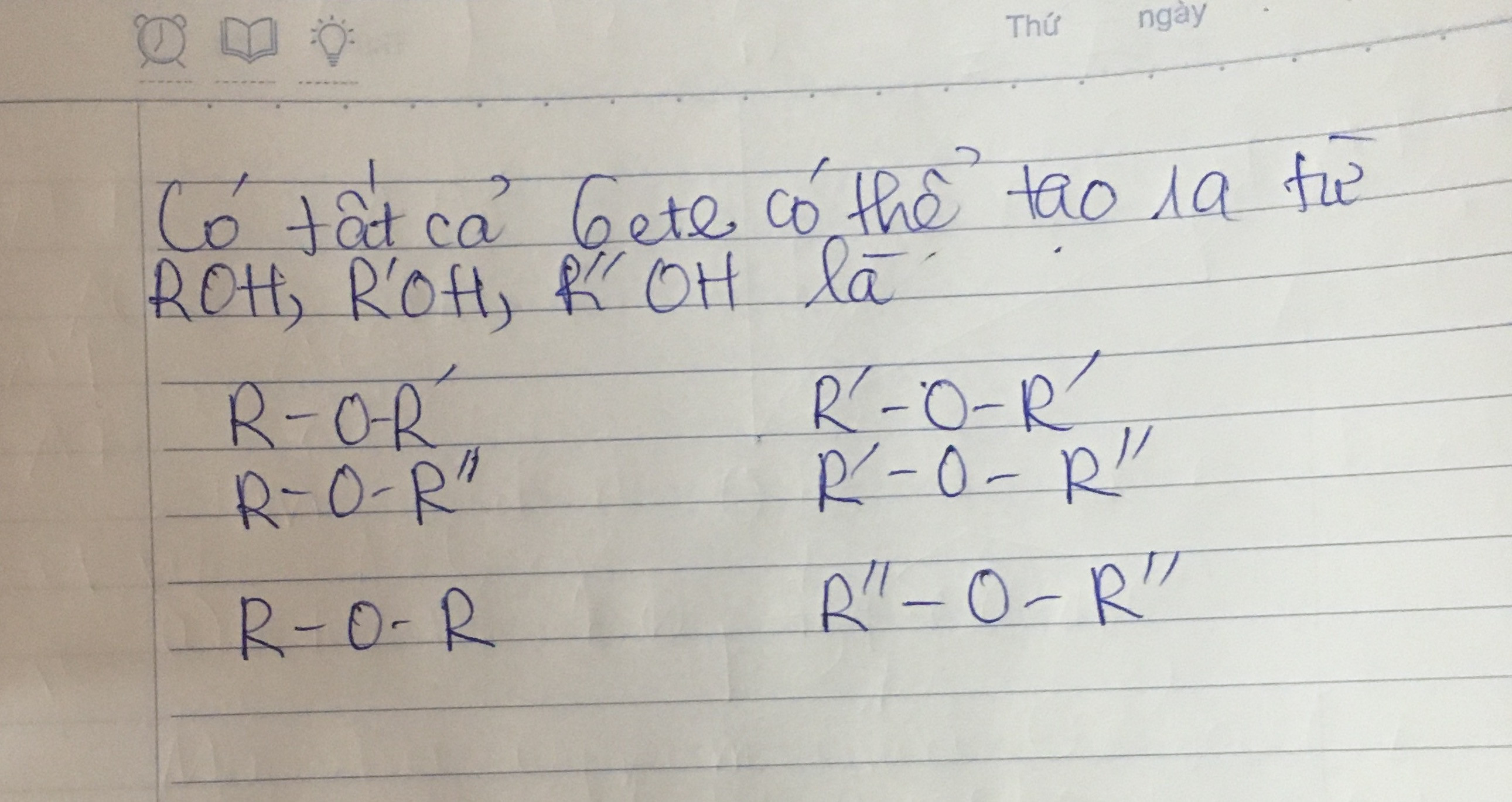 Đun nóng hỗn hợp ba rượu rOH r'oh r''oh với axit sunfuric ở 140 độ c. Hỏi có thể tạo thành tối đa bnhieu lại ete