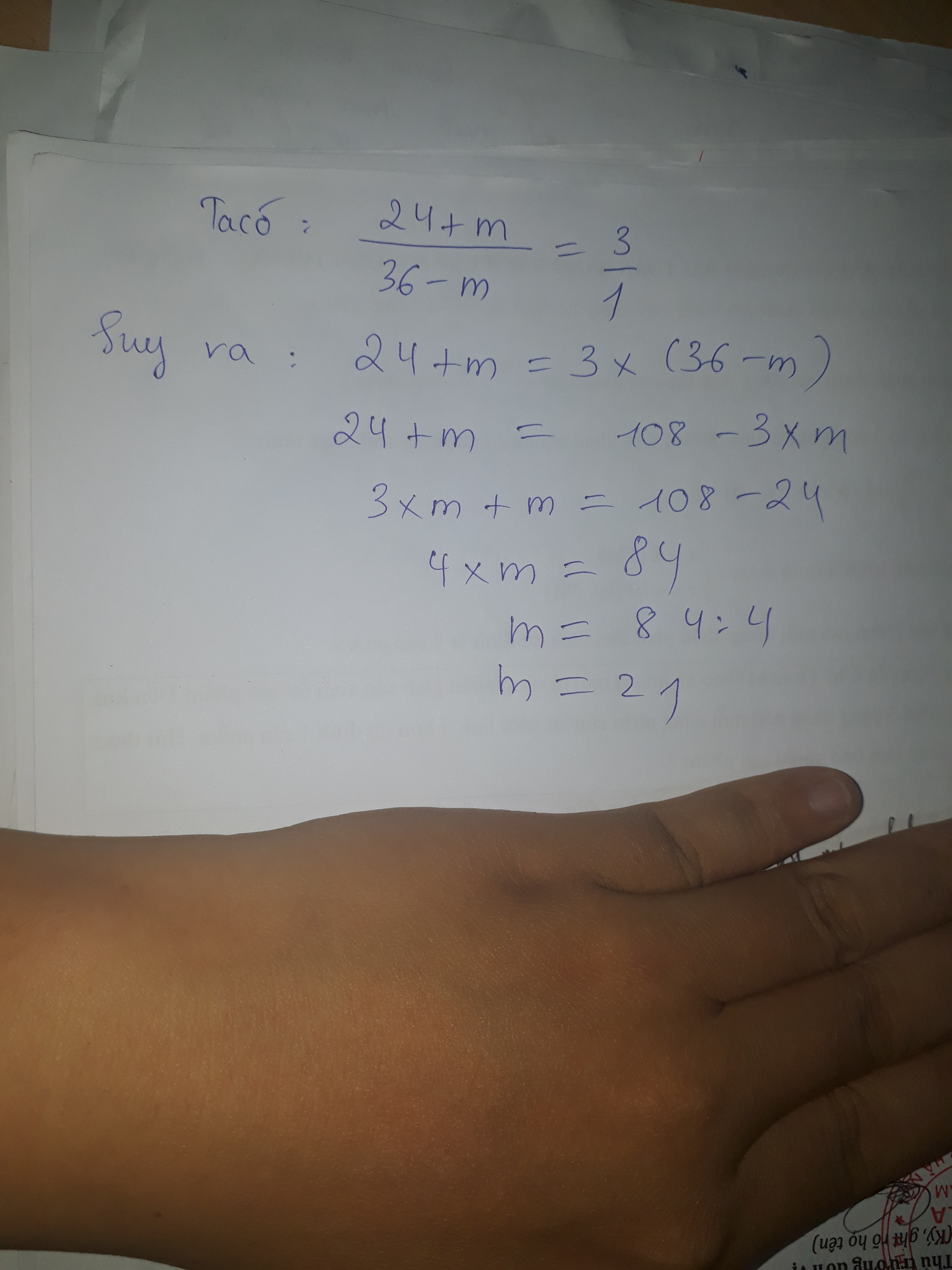 Cho phân số 24/36 và chữ số tự nhiên m. Tăng tử số m đơn vị, giảm mẫu số m đơn vị thì được phân số 3/1