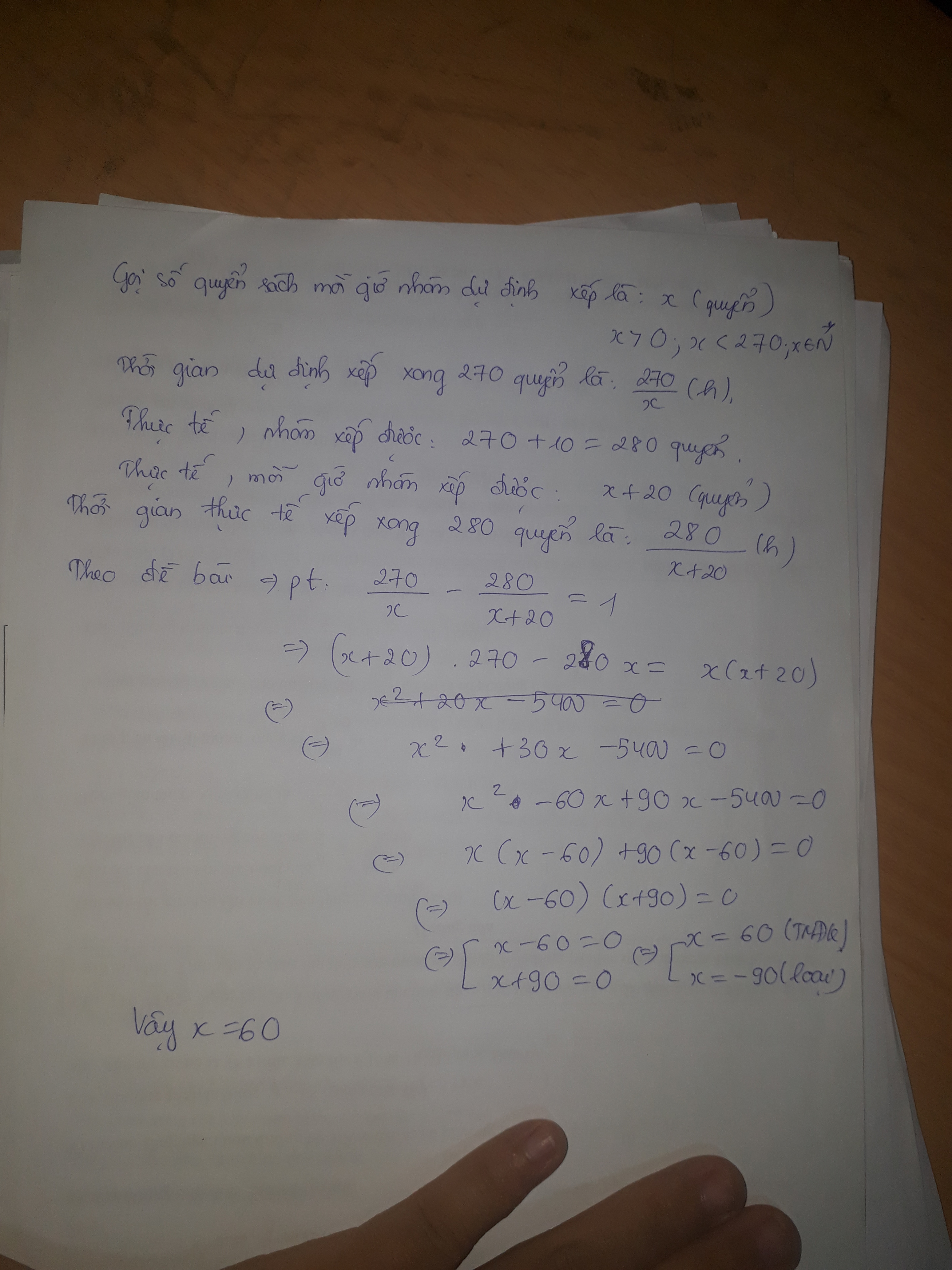Một nhóm học sinh đc giao sắp xếp 270 quyển sách vào tủ trong 1 thời gian nhất định. Khi bắt đầu làm việc nhóm đc bổ sung học sinh nên mỗi giờ nhóm sắp xếp đc nhiều hơn dự định 20 quyển, vì vậy không những hoàn thành trước dự định 1 giờ mà còn vượt mức đc giao 10 quyển sách. Hỏi số quyển sách mỗi giờ nhóm dự định sắp xếp là bao nhiêu?