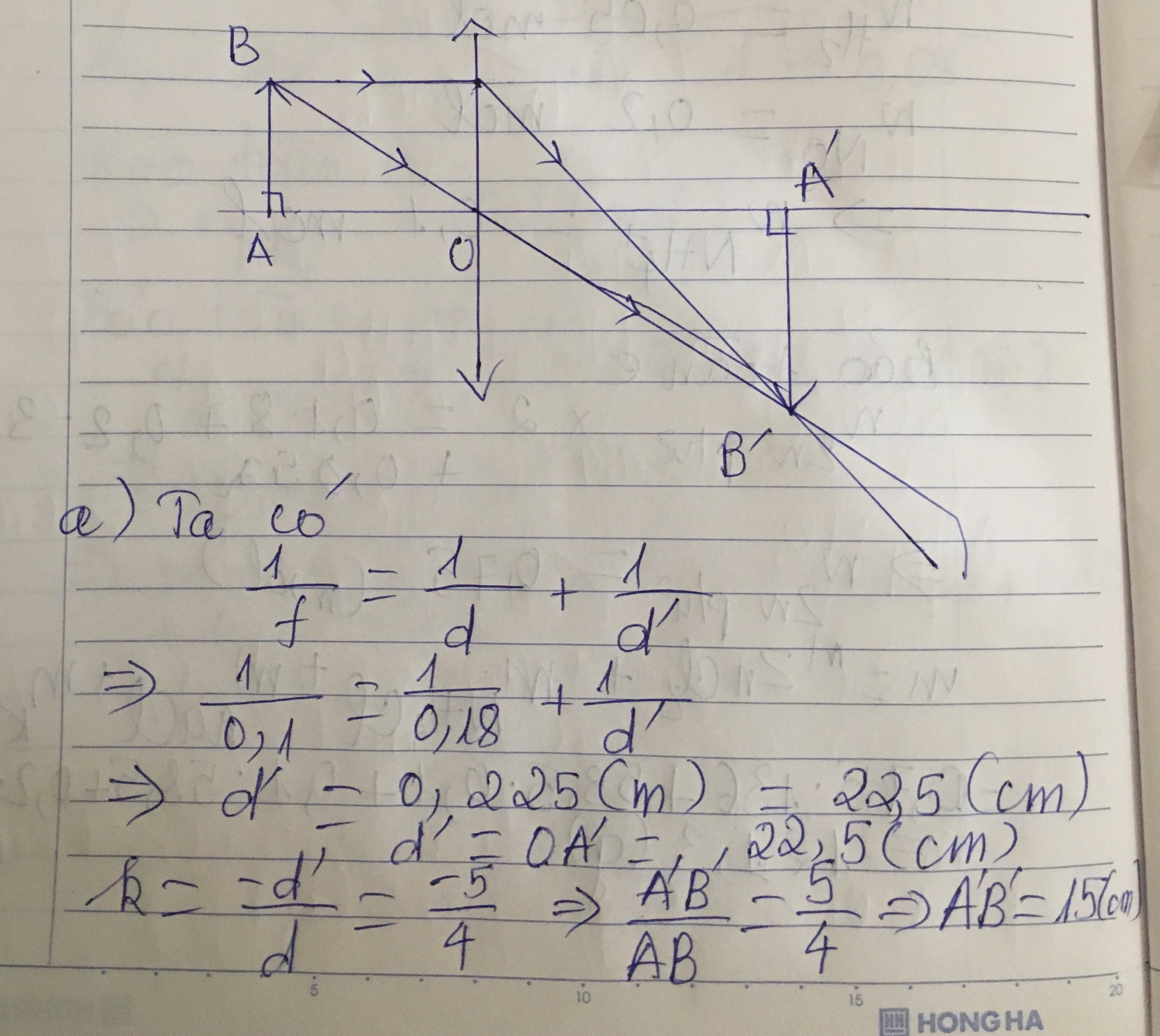 Cho thấu kính hội tụ có tiêu cự F=10, vật sáng AB đặt vuông góc với trục chính . AB cao 12cm, AO=18cm
