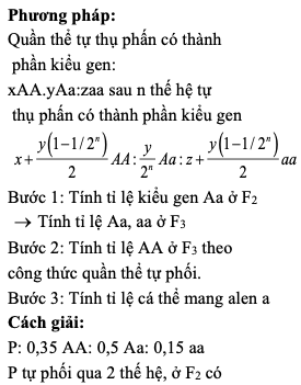 Thế hệ xuất phát (P) của 1 quần thể tự thụ phấn có thành phần kiểu gen là: 0,35 AA: 0,5 Aa: 0,15 aa. Giả sử các cá thể có kiểu gen aa không có khả năng sinh sản nhưng có sức sống bình thường. Theo lí thuyết, ở có số cây mang alen a chiếm tỉ lệ
