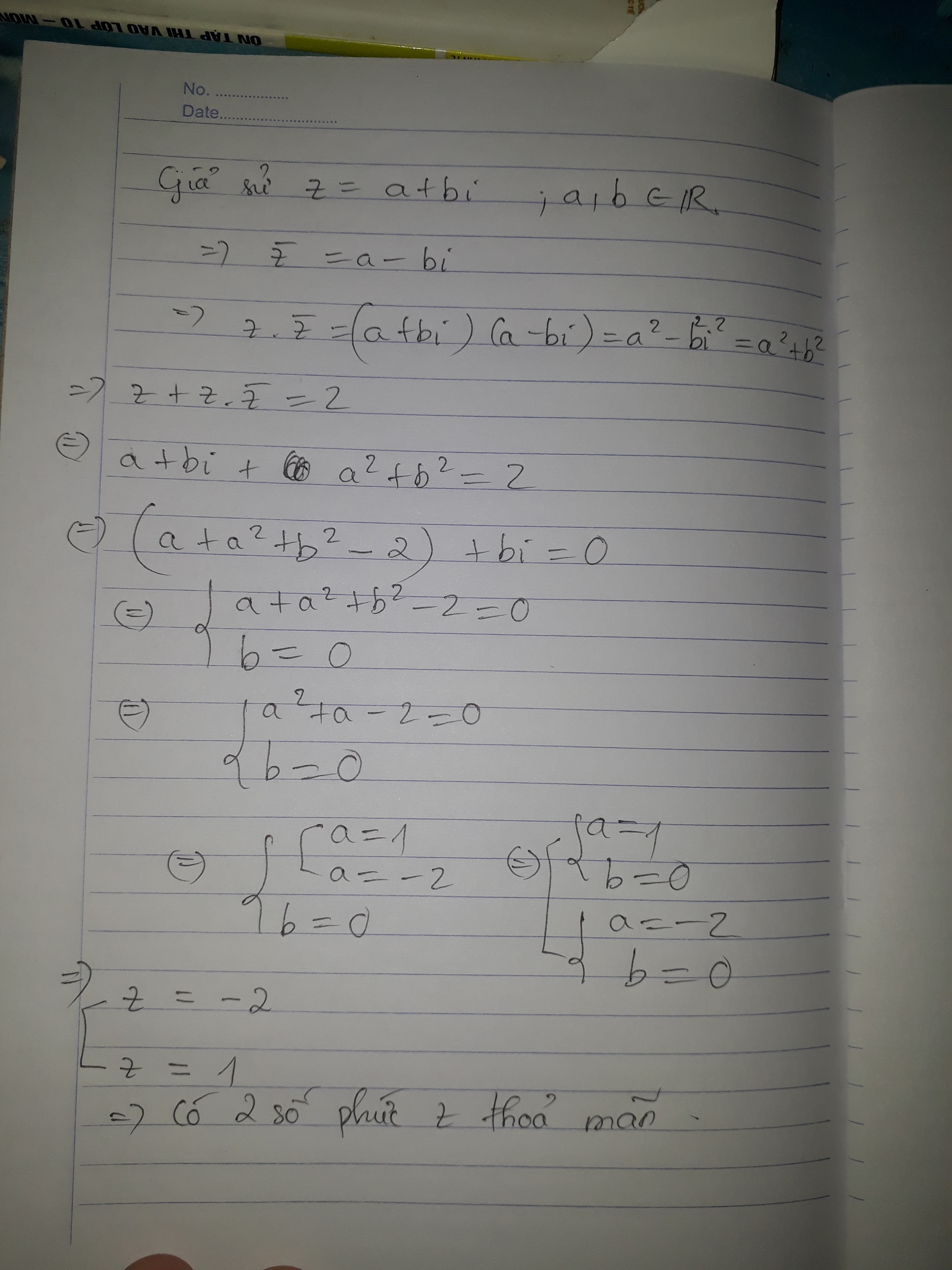 z+z.z liên hợp =2. zliên hợp có bao nhiêu số phức z thỏa mãn