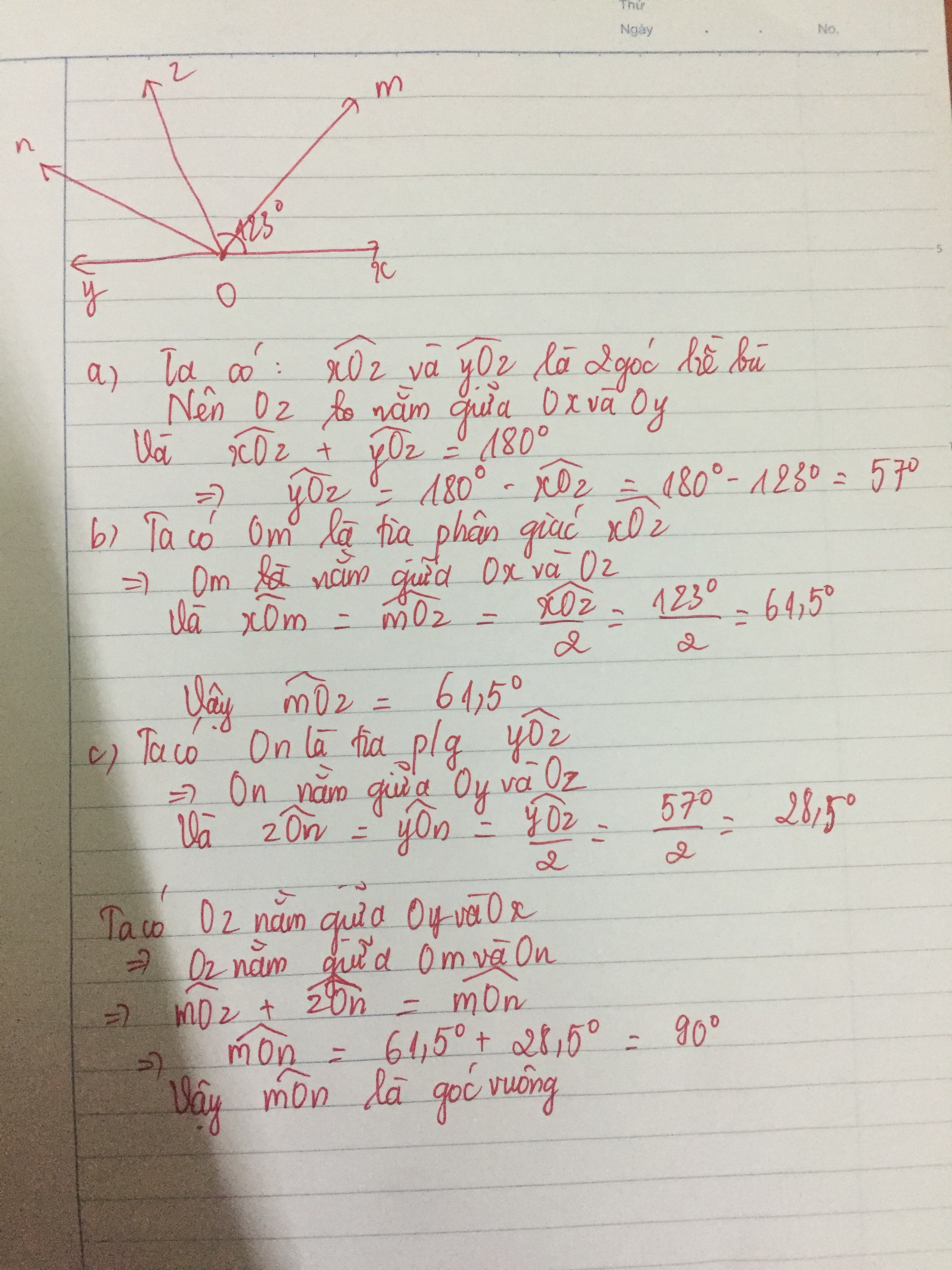 Cho xOz và yOZ là hai góc kề bù sao cho xOz = 123° . Gọi Om, On lần lượt là tia phản giác xOz, yOz a. Tính yOz