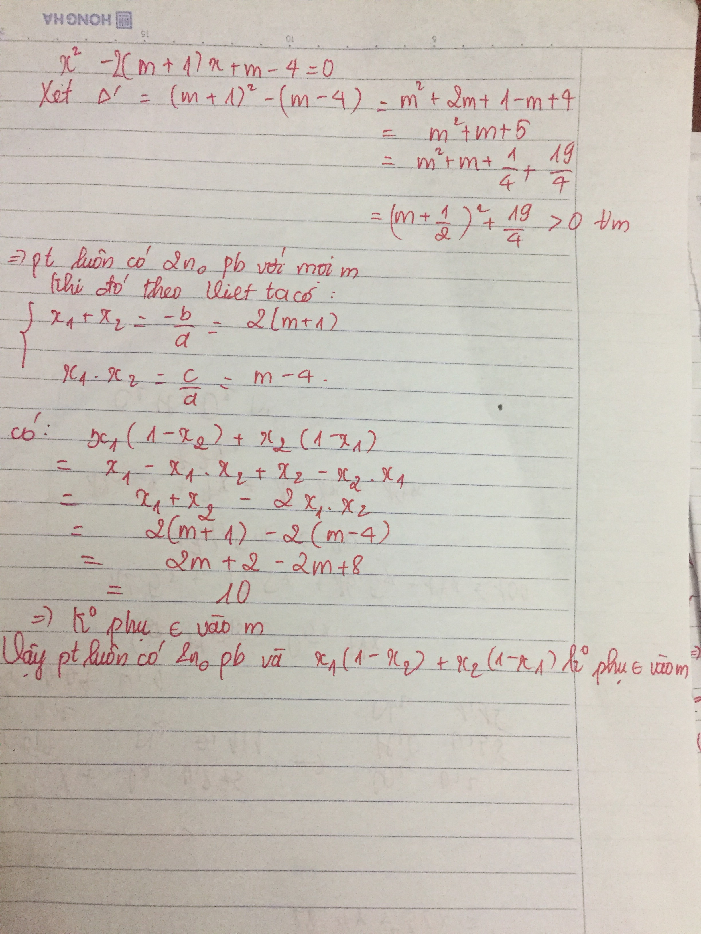 Chứng minh rằng phương trình x bình -2(m+1)x+m-4=0 luôn có 2 nghiệm phân biệt x1,x2 và biểu thức M=x1(1-x2)+x2(1-x1) không phụ thuộc vào m