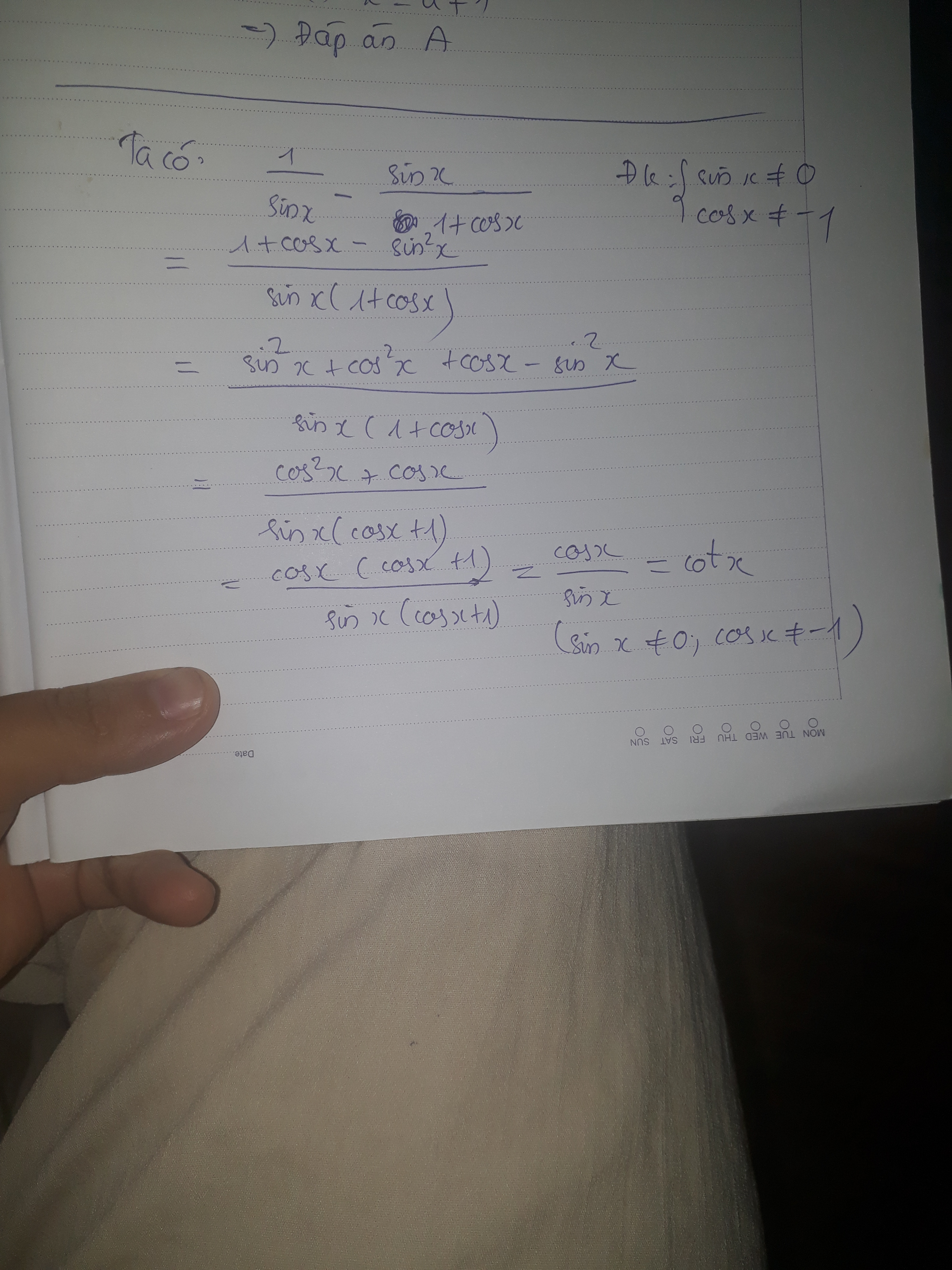 Chứng minh 1sinx-sinx1+cosx=cotx