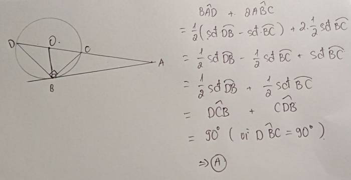 từ một điểm A ở bên ngoài đg tròn (O) ,kẻ tiếp tuyến AB(B là tiếp điểm )và cát tuyến ACD đi qua tâm O của đg tròn (C và D thuộc (O) ,C nằm giữa A vàD ).Tính BAD+2ABC