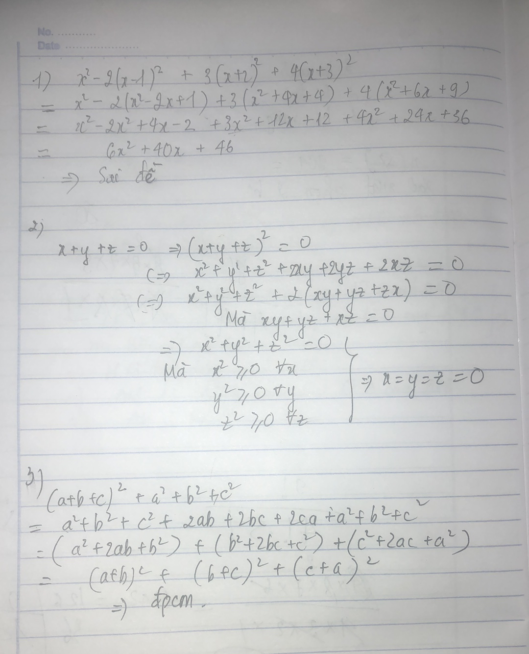 Bài 1: CM rằng biểu thức sau viết dưới dạng tổng các bình phương của 2 biểu thức: x²-2(x-1)²+3(x+2)²+4(x+3)²