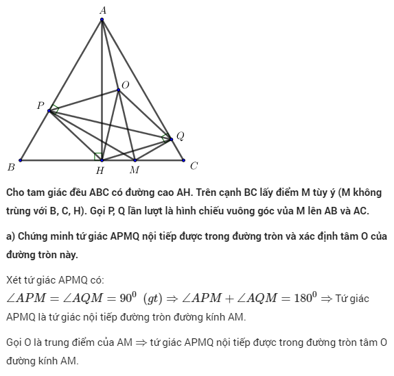 Cho tam giác đều ABC có đường cao AH (H thuộc BC). Trên cạnh BC lấy điểm M (M không trùng với B, C, H). Gọi P và Q lần lượt là hình chiếu vuông góc của M trên hai cạnh AB và AC.