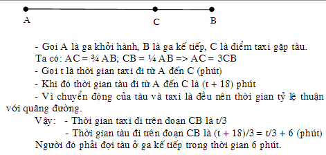 Một người đi tầu hoả nhưng đến ga trể 18 phút sau khi tầu rời ga. người đó bèn đi taxi ngay lúc đó để đón tầu ở ga kế tiếp và đuổi kịp tầu tại thời điểm nó đã đi được ¾ quảng đường giữa hai ga. hỏi người đó phải ngồi đợi tầu ở ga kế tiếp trong bao lâu ? (coi tầu và taxi có vận tốc không đổi trong quá trình chuyển động).