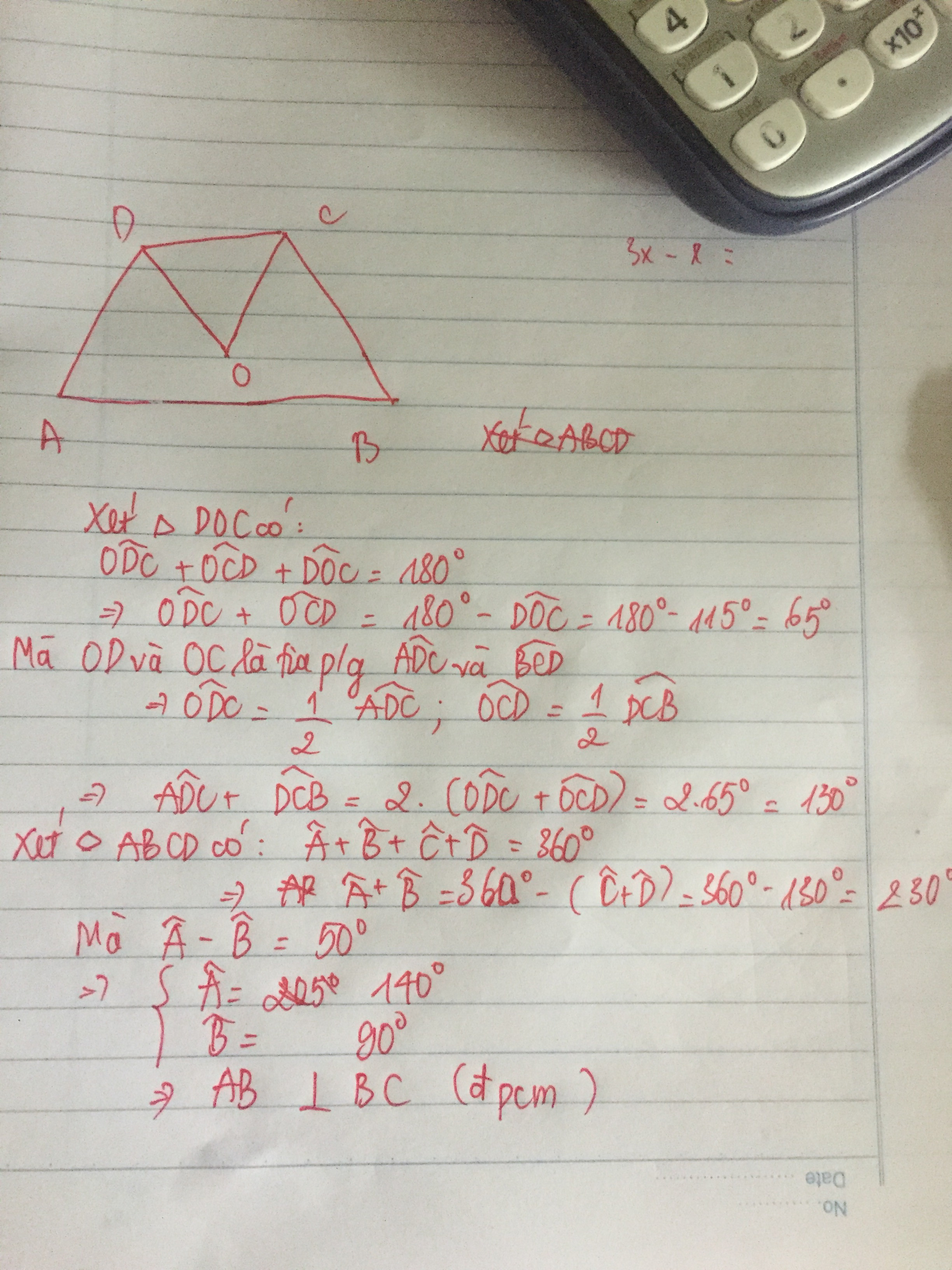 Cho tứ giác ABCD, góc A-- góc B=50⁰. Các tia phân giác của góc C và D cắt nhau tại O. Cho biết góc COD=115⁰. CM: AB vuông góc với BC
