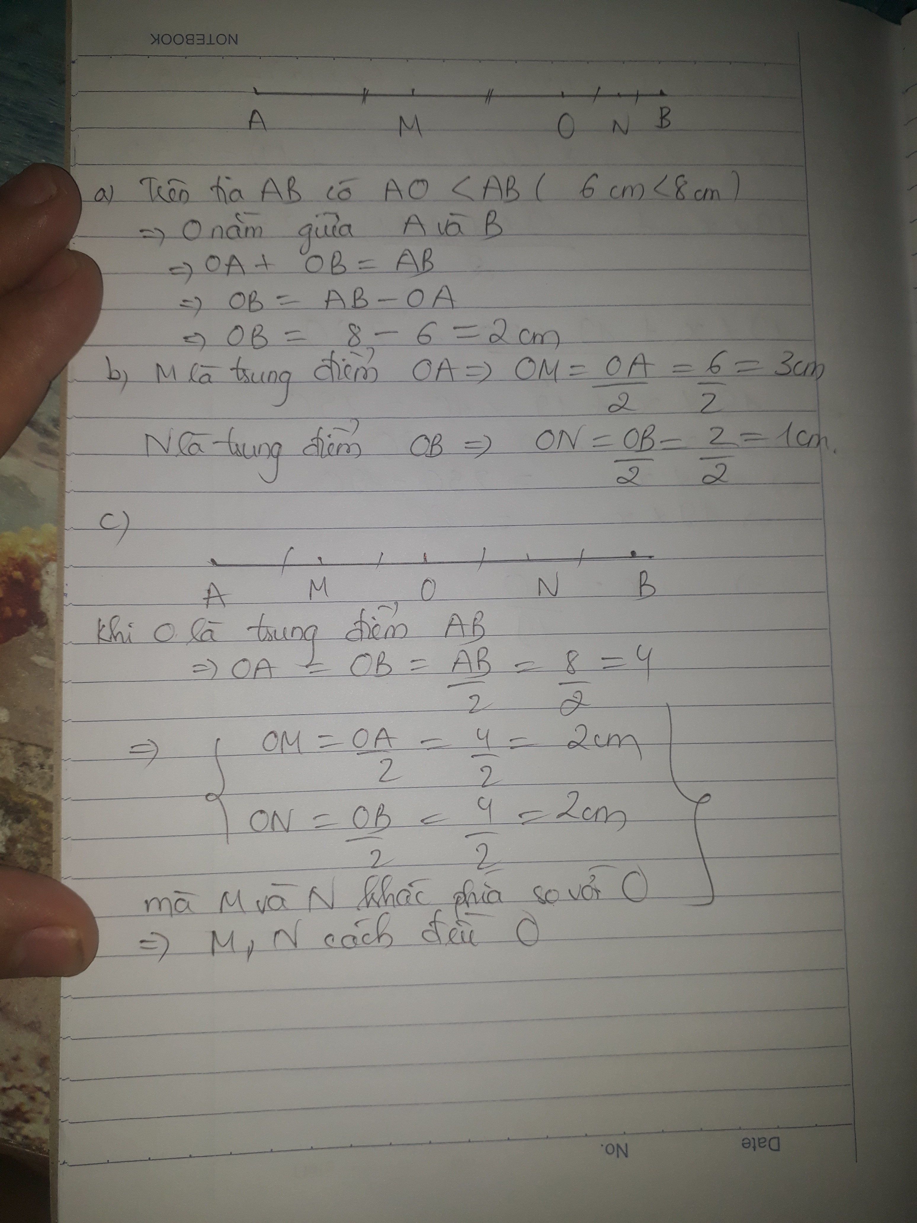 c) khi O là trung điểm đoạn AB và M,N lần lượt là trung điểm của OA và OB. Chứng tỏ M và N cách đều O.( học sinh phải vẽ hình)