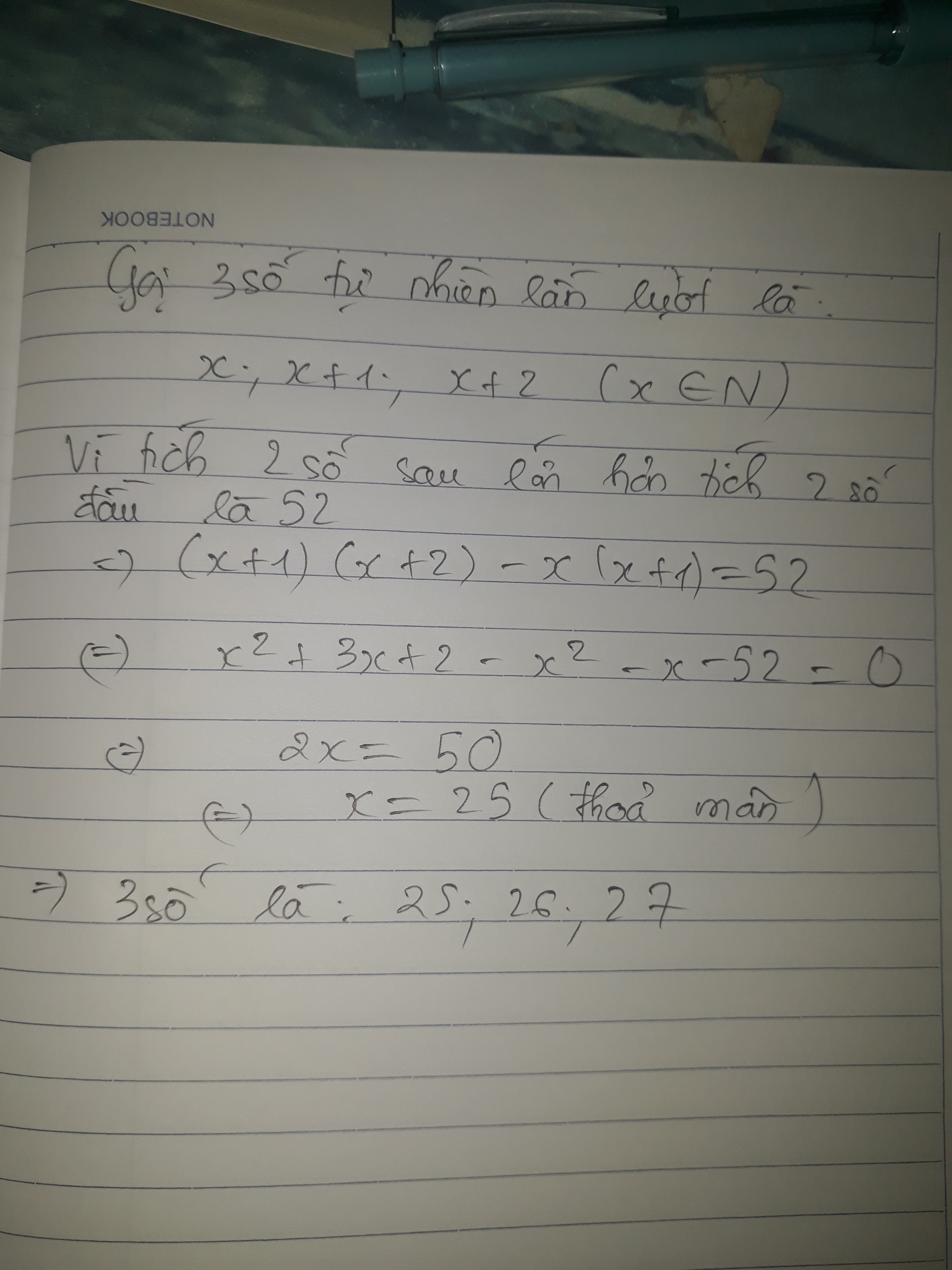 Tìm 3 số tự nhiên liên tiếp biết tích của 2 số sau lớn hơn tích của 2 số đầu là 52