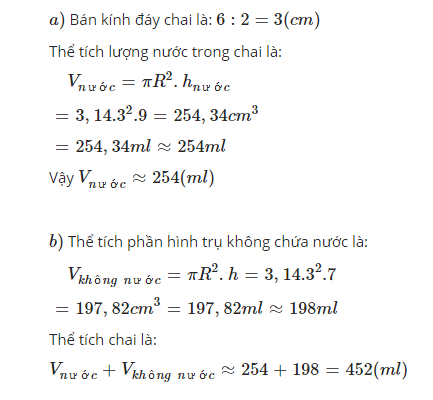 Có một chai nước đựng nước suối, bạn an đo đuờng kính của đáy chai bằng 6cm. Đo chiều cao của phần nước trog chai đc 9cm rồi lật chai và đo đc chiều cao của phần hình trụ ko chứ nước đc 7cm.