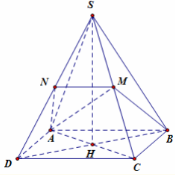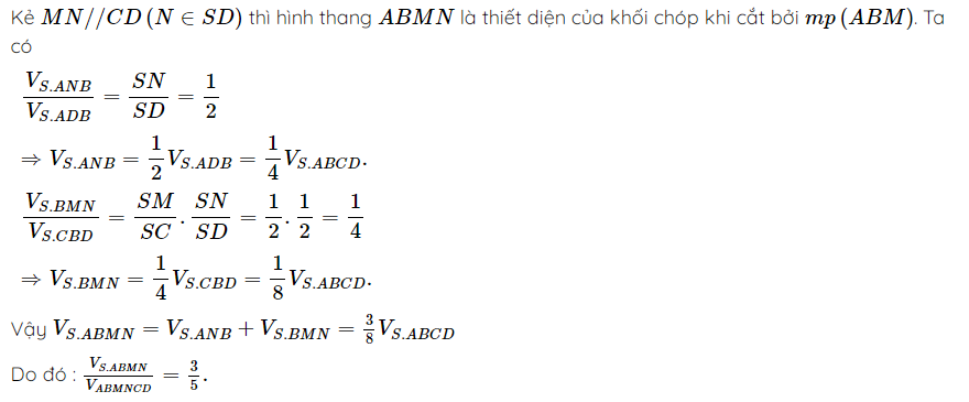 Cho khối chóp tứ giác đều S.ABCD. Một mặt phẳng (a) qua A, B và trung điểm M của SC. Tính tỉ số thể tích của hai phần khối chóp bị phân chia bởi mặt phẳng đó