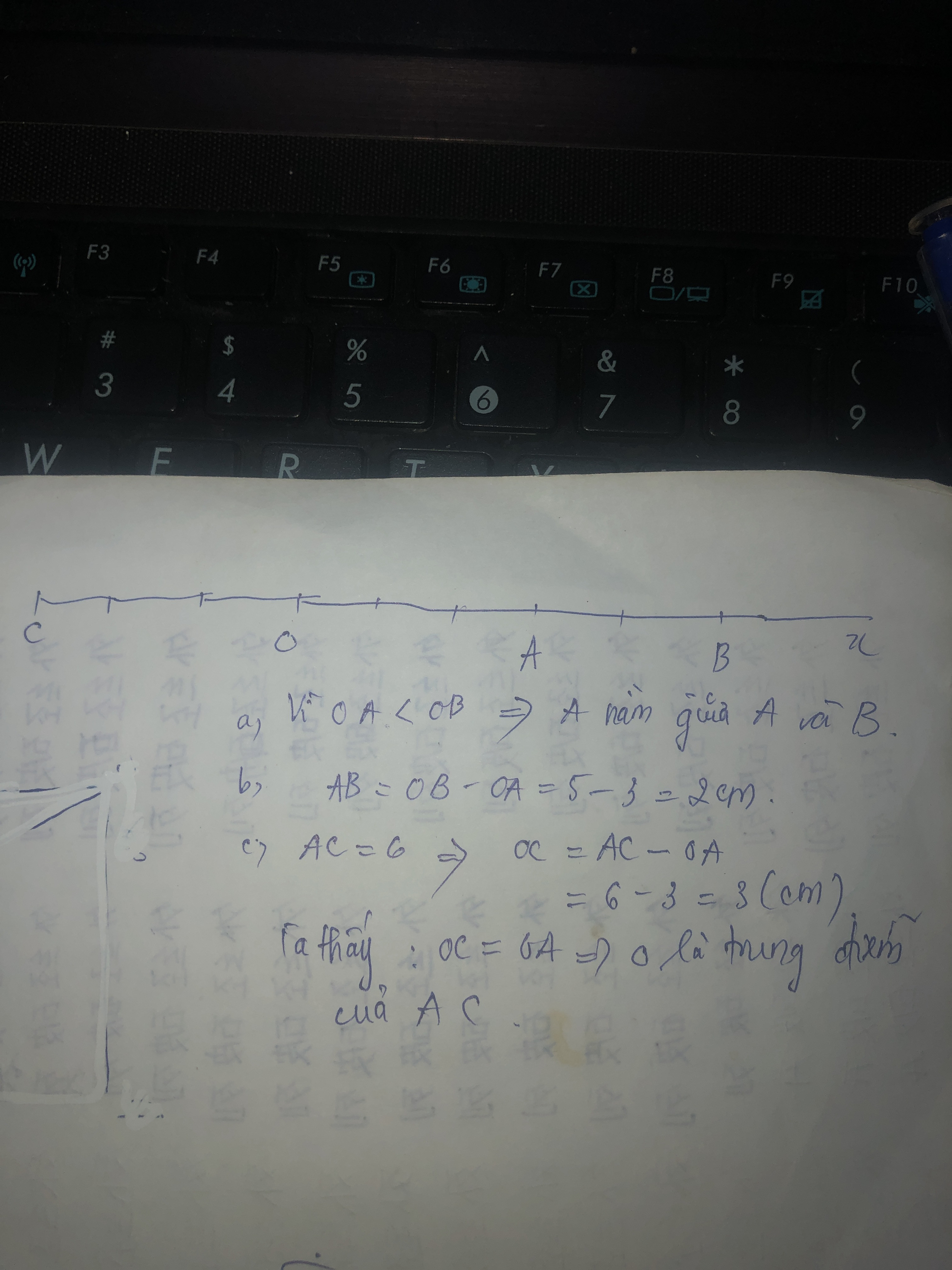 Trên tia OX lấy điểm B,A sao cho OA =3cm,OB=5cm.a) điểm nào nằm giữa2 trong3 điểm O,A,B? Vì sao?b) tính ABc)trên tia đối của tia Ox lấy điểm C sao cho AC =6cm, chứng tỏ O là trung điểm AC
