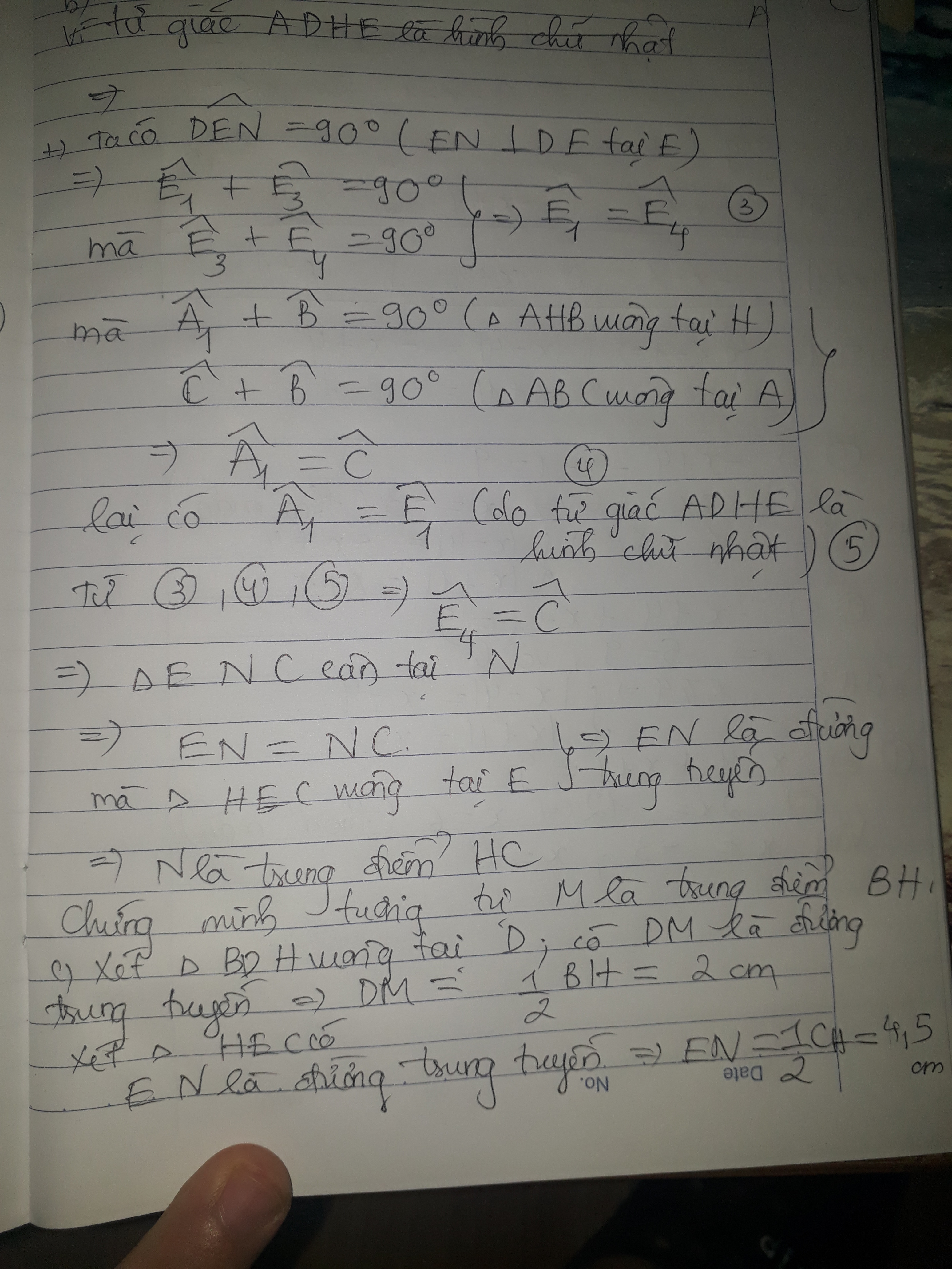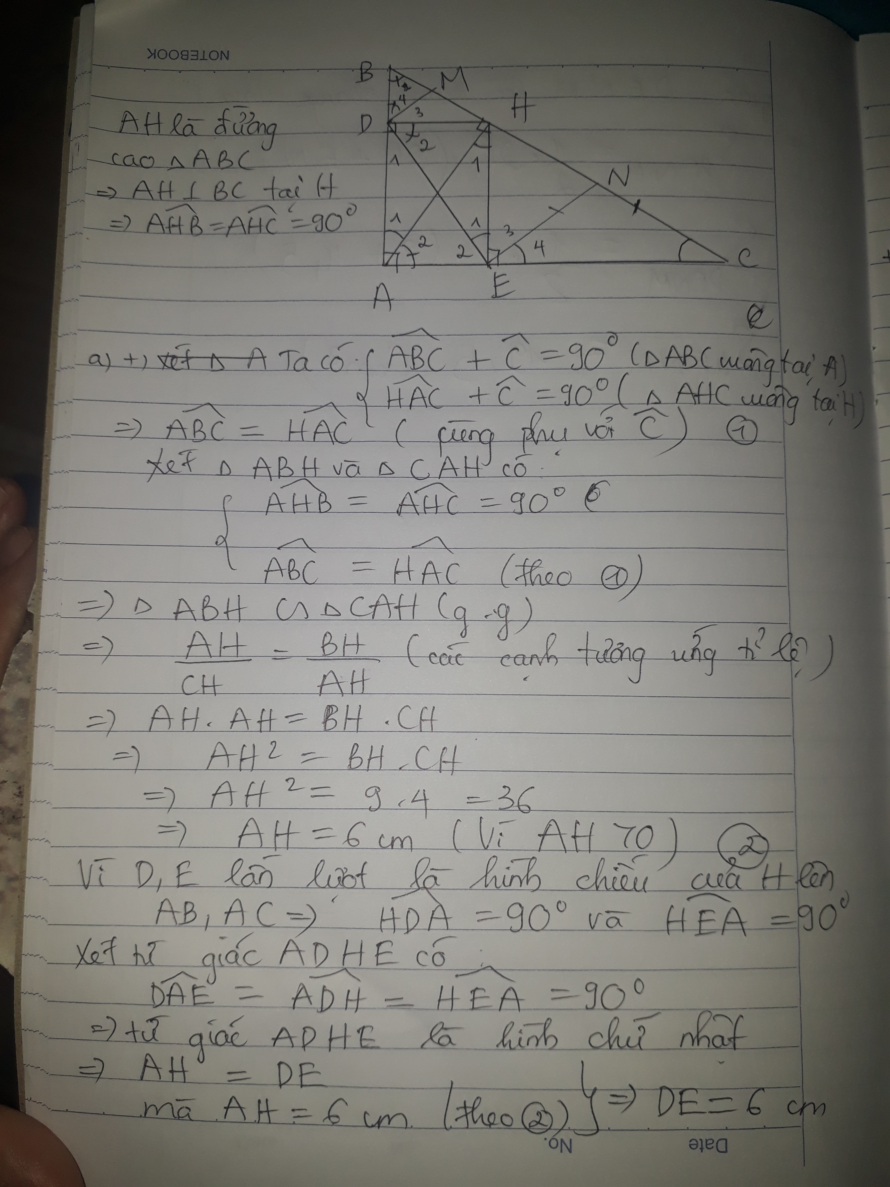 b) DM vuông góc với DE tại D,EN vuông góc với DE tại E. CM: M là trung điểm của BH,N là trung điểm của HC