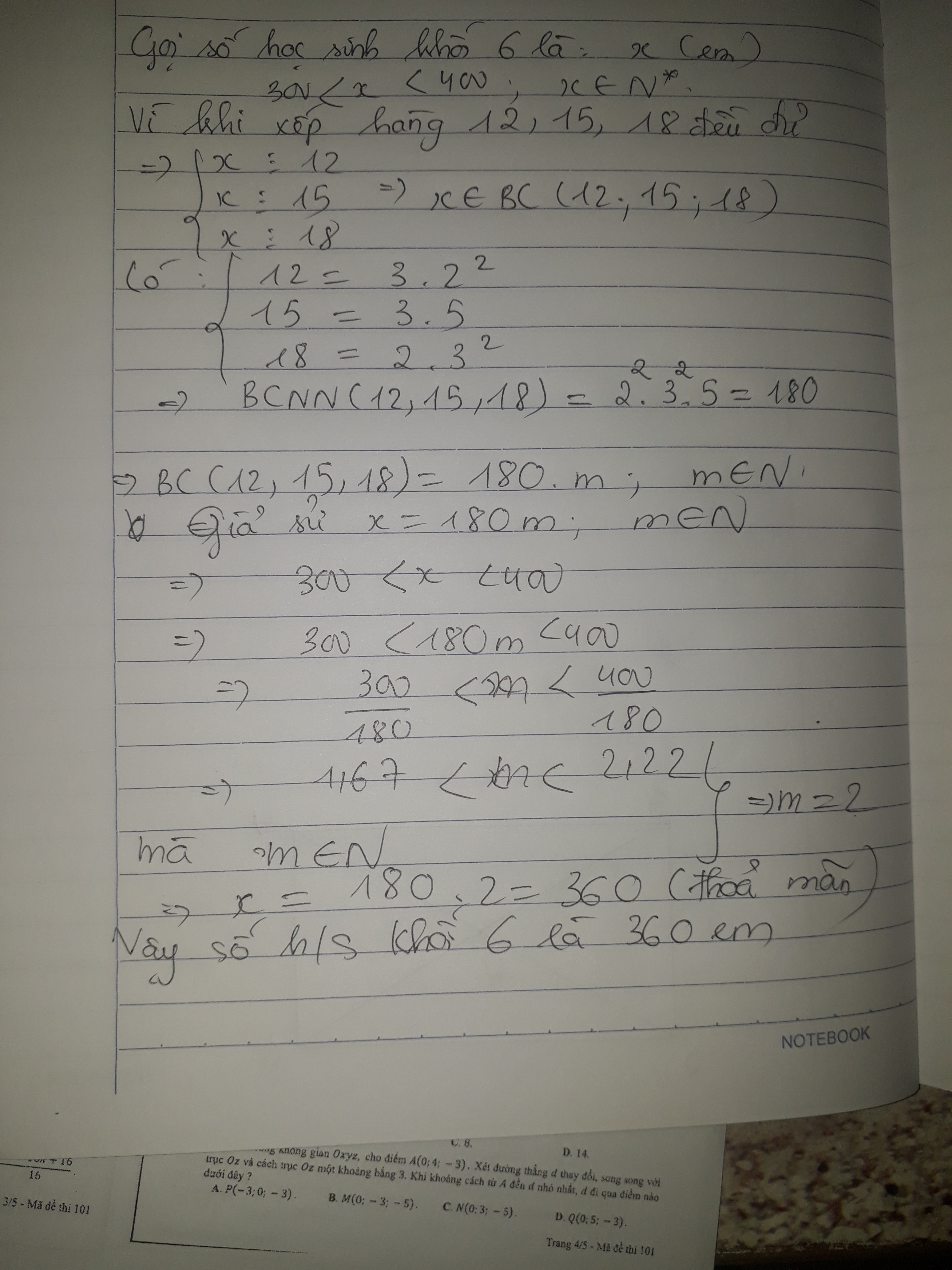 Số hs khối 6 của trường từ 300 đến 400 e. Biết rằng số hs đó khi xếp hàng 12,15,18 đều đủ. Tính số hs?