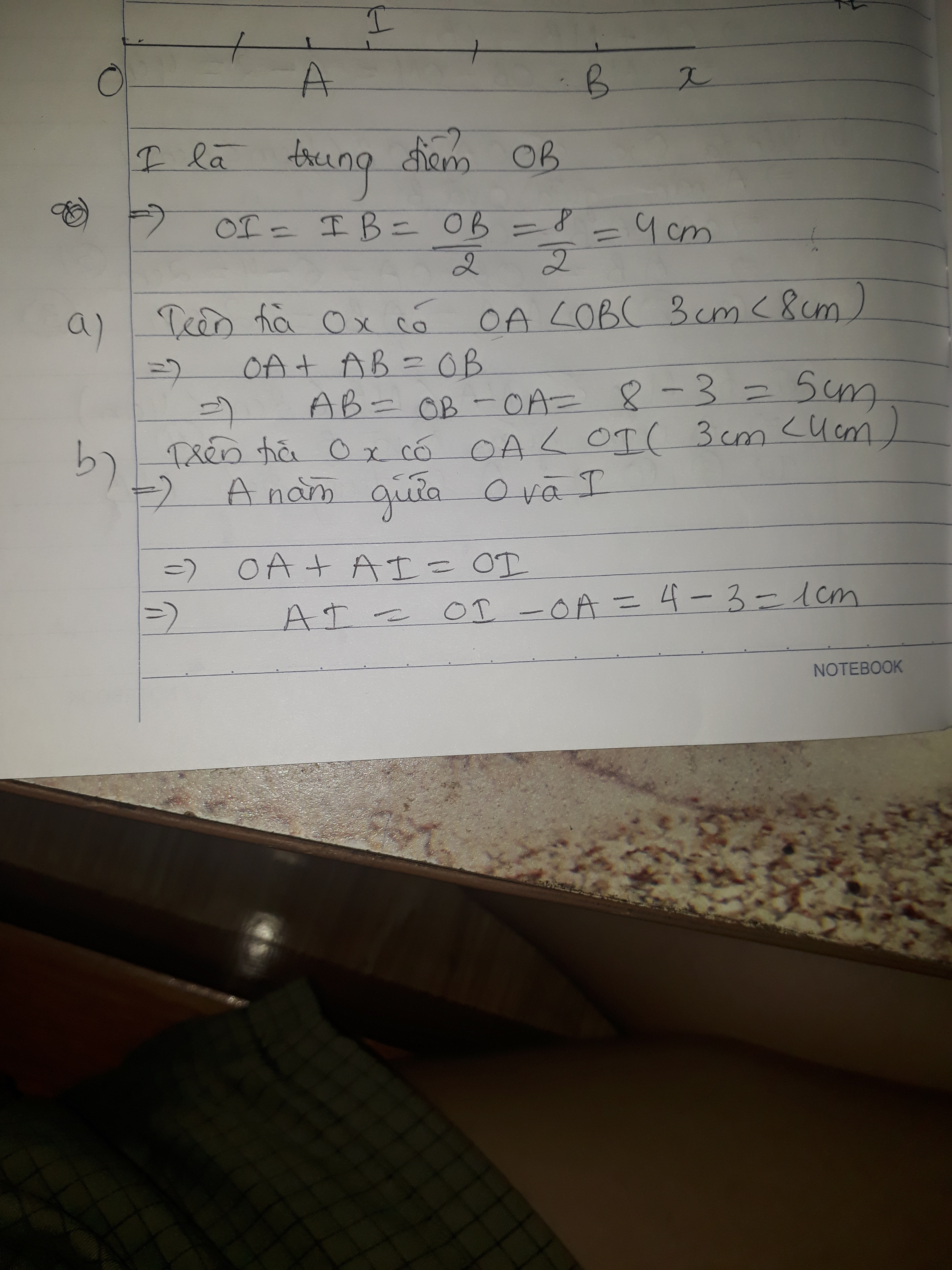 Trên tia Ox lấy 2 điểm A,B sao cho OA=3cm,OB=8cm.a) tính AB b) gọi I là trung điểm của đoạn thẳng OB. Trong 3 điểm A,O,I điểm nào nằm giữa 2 điểm còn lại ? Vì sao? c) tính AI