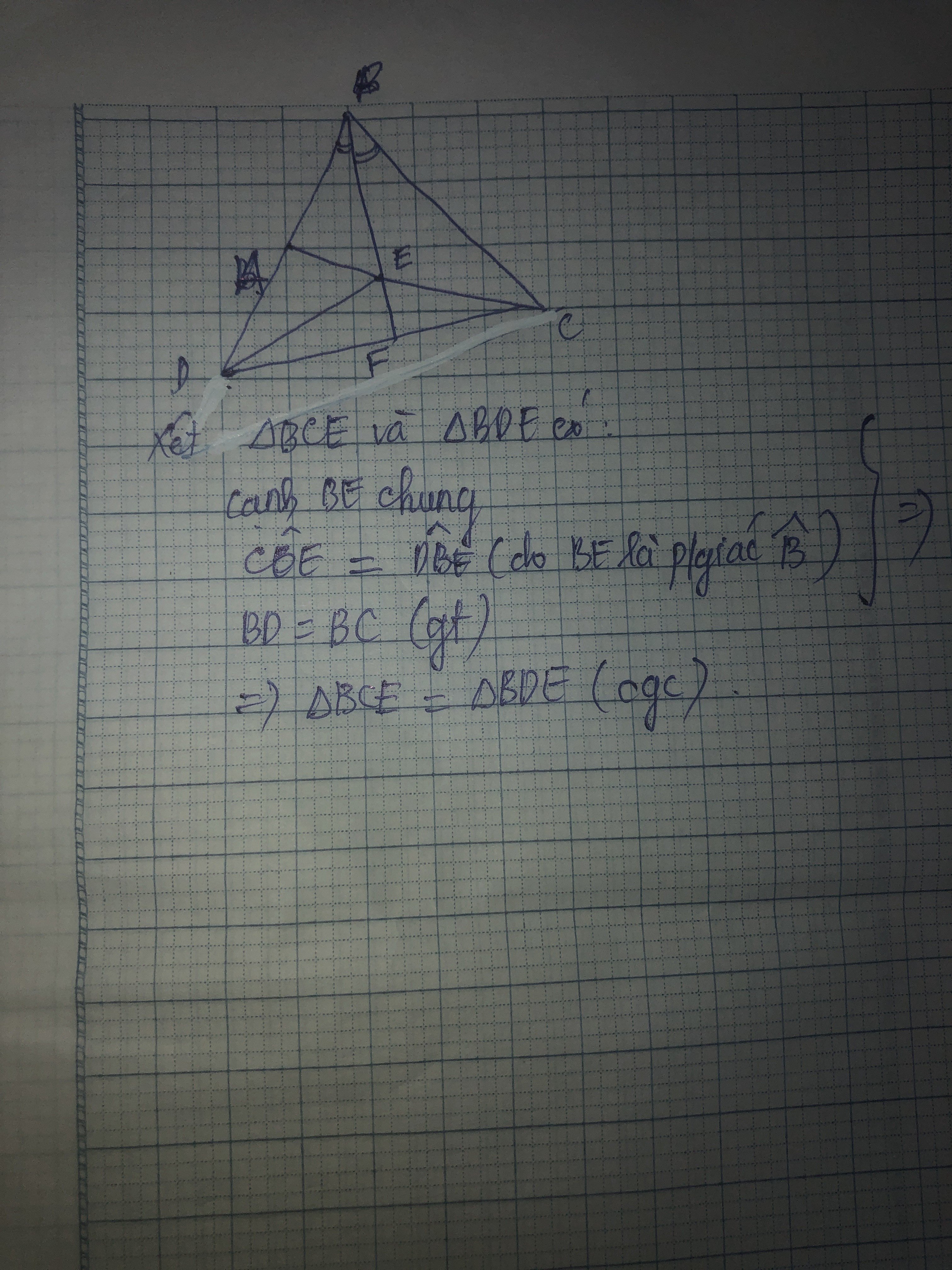Cho tam giác ABC có AB bé hơn AC. Trên tia đối của tia AB lấy điểm D âo cho BD=BC. Tia phân giác của góc B cắt AC, DC tại E và F chứng minh rằng tam giác DBE =Tam giác CBE
