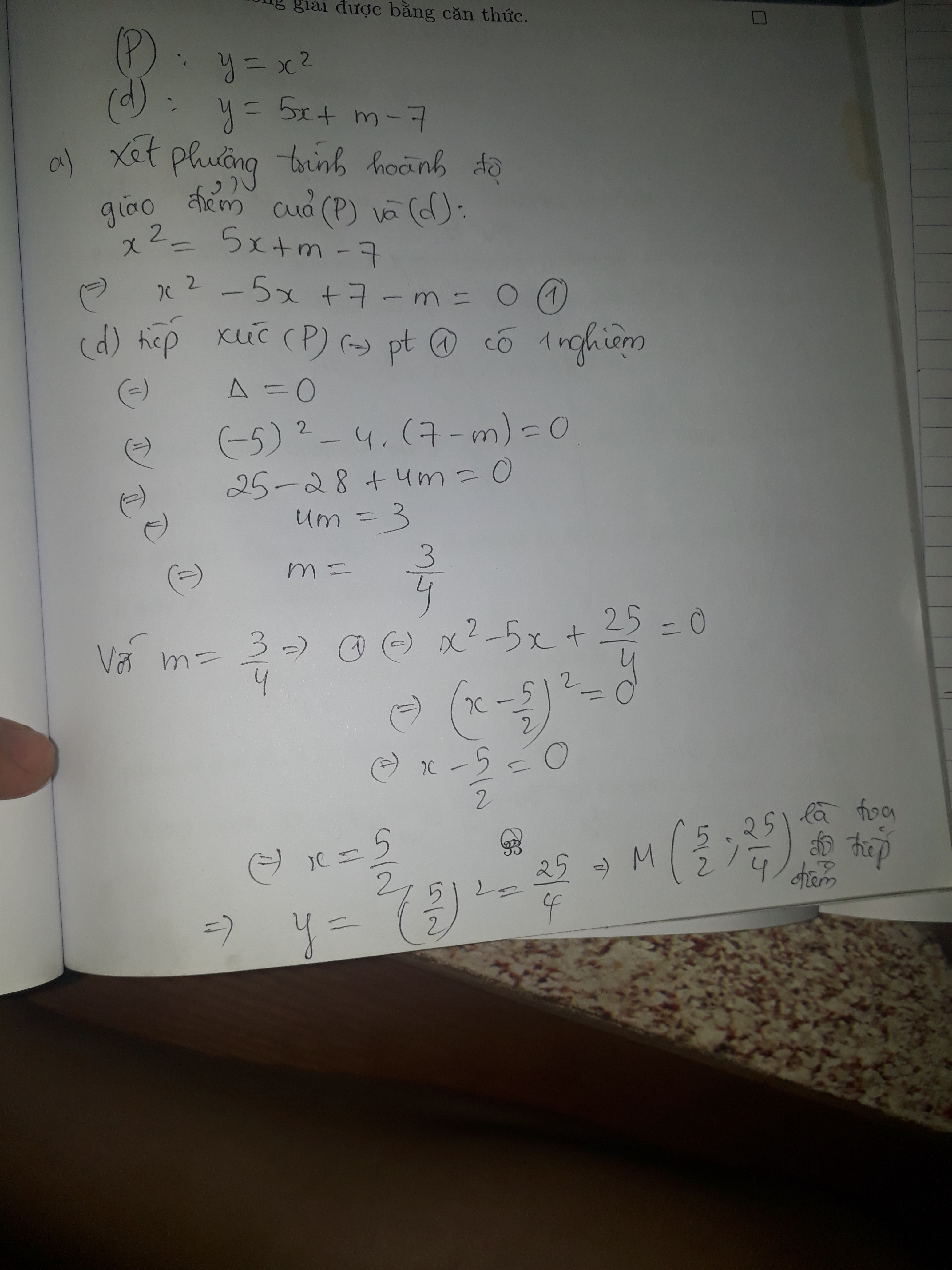 Cho parabol (p) :y=và đươngf thẳng (d) :y= 5x + m - 7