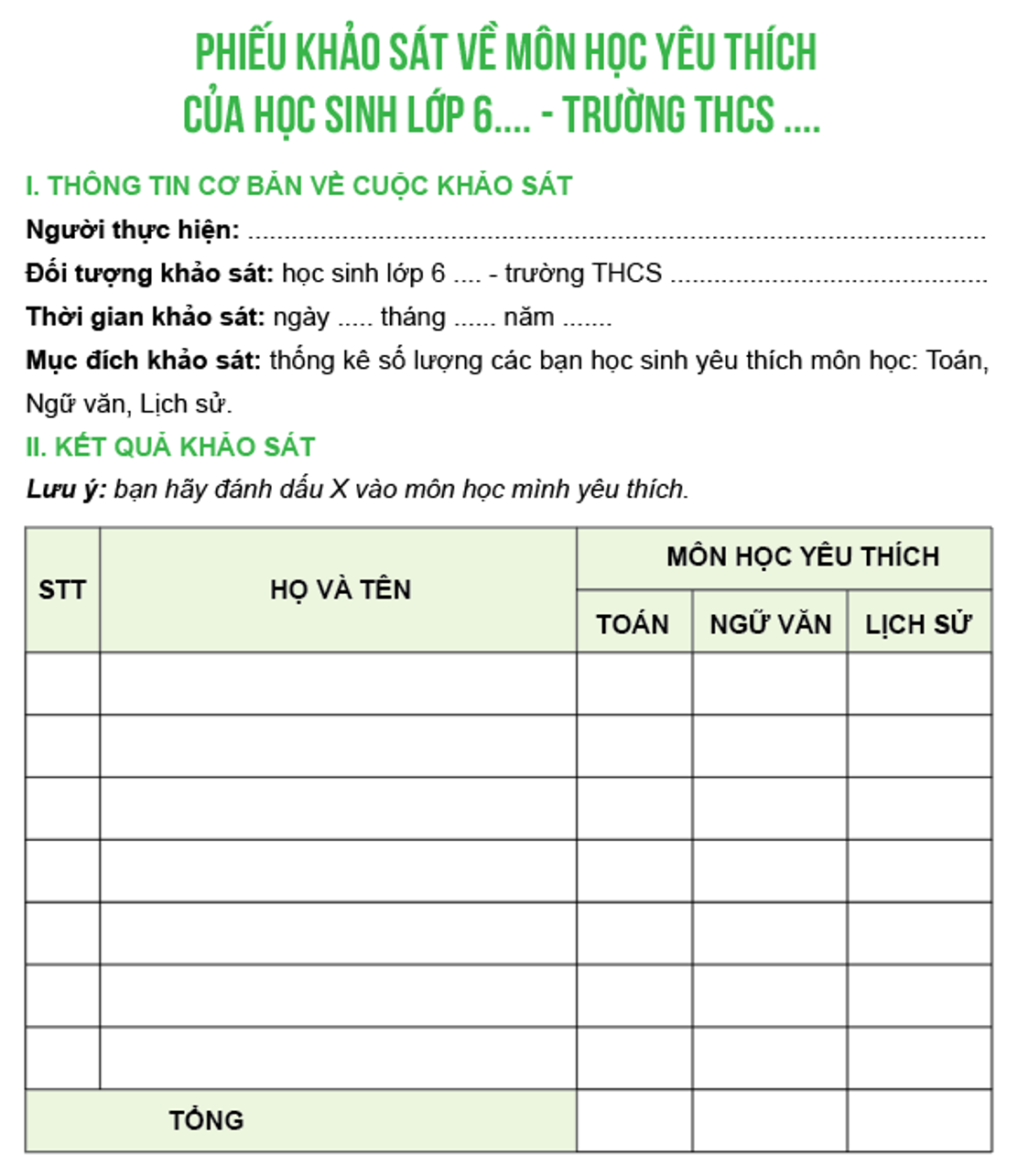- Học sinh tự tiến hành điều tra và thống kê số lượng thông qua phiếu điều tra (có thể tham khảo mẫu dưới đây).