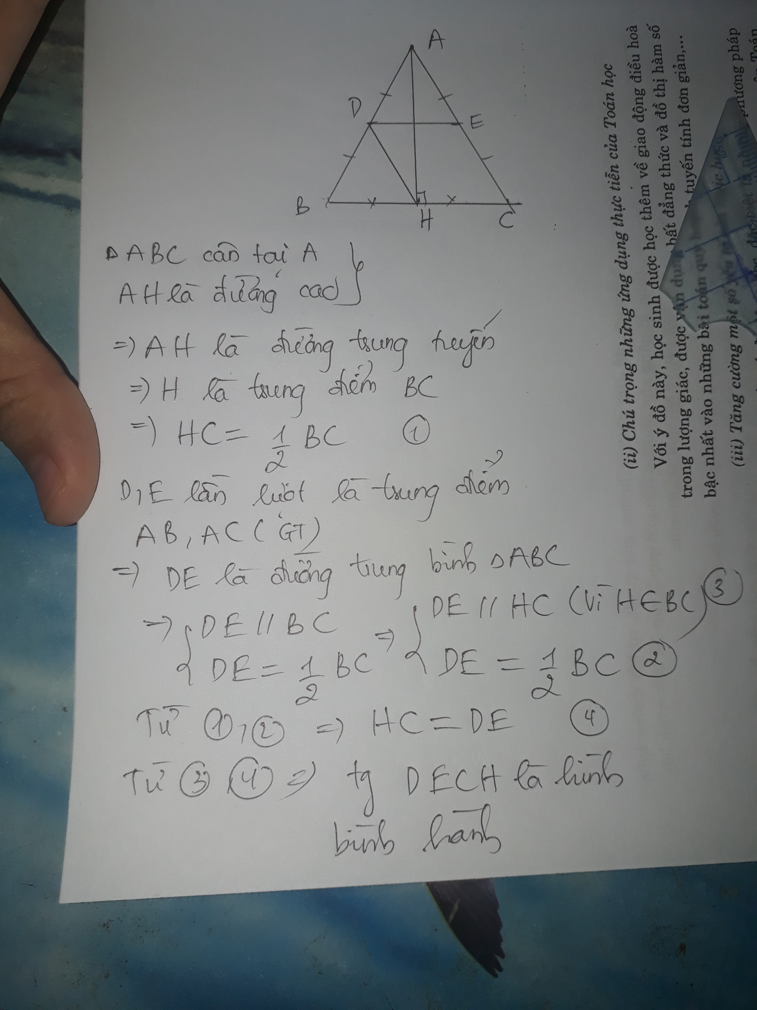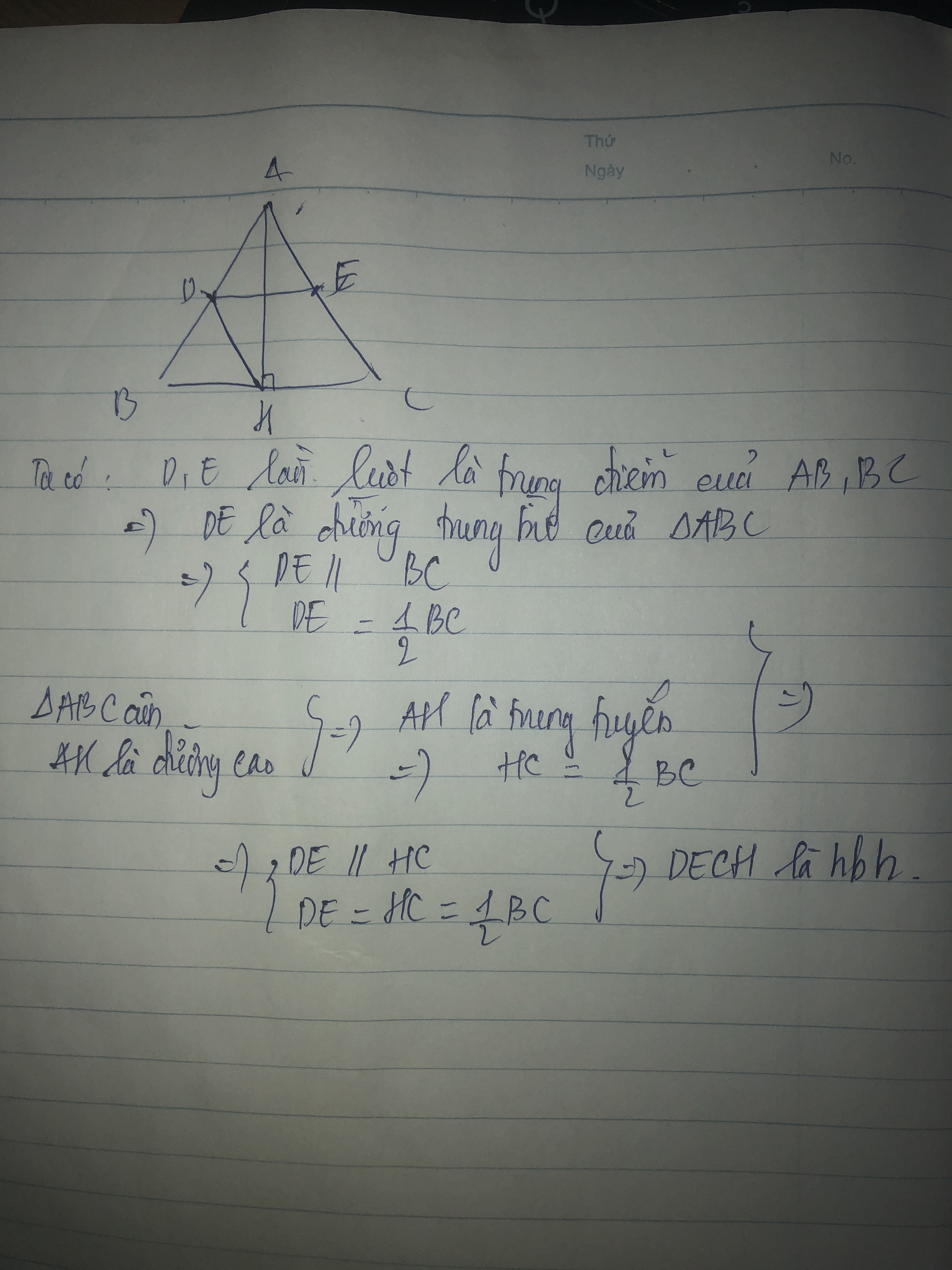 cho tam giác nhọn abc cân tại a , đường cao ah . gọi d và e theo thứ tự là trung điểm của ab , ac