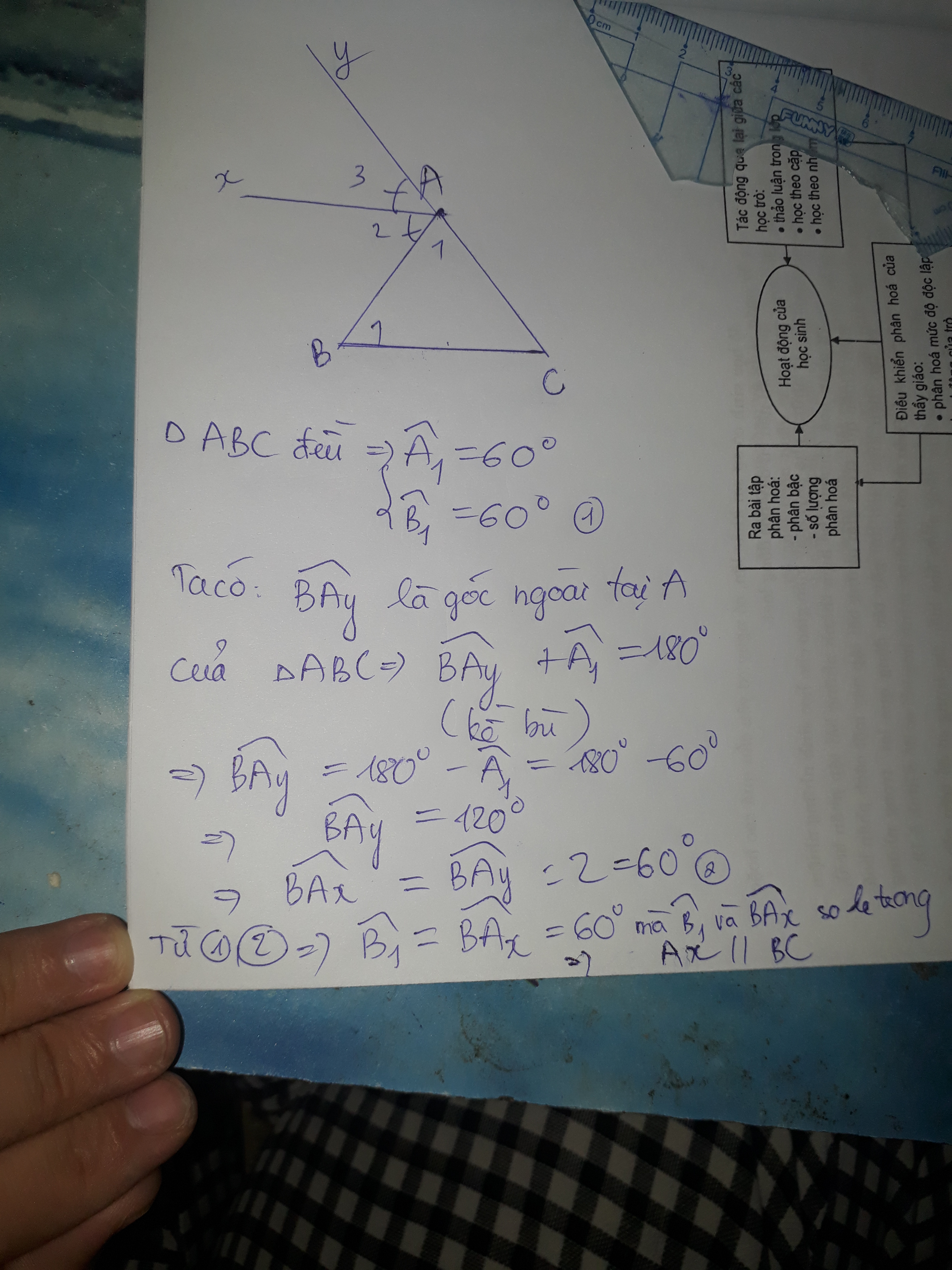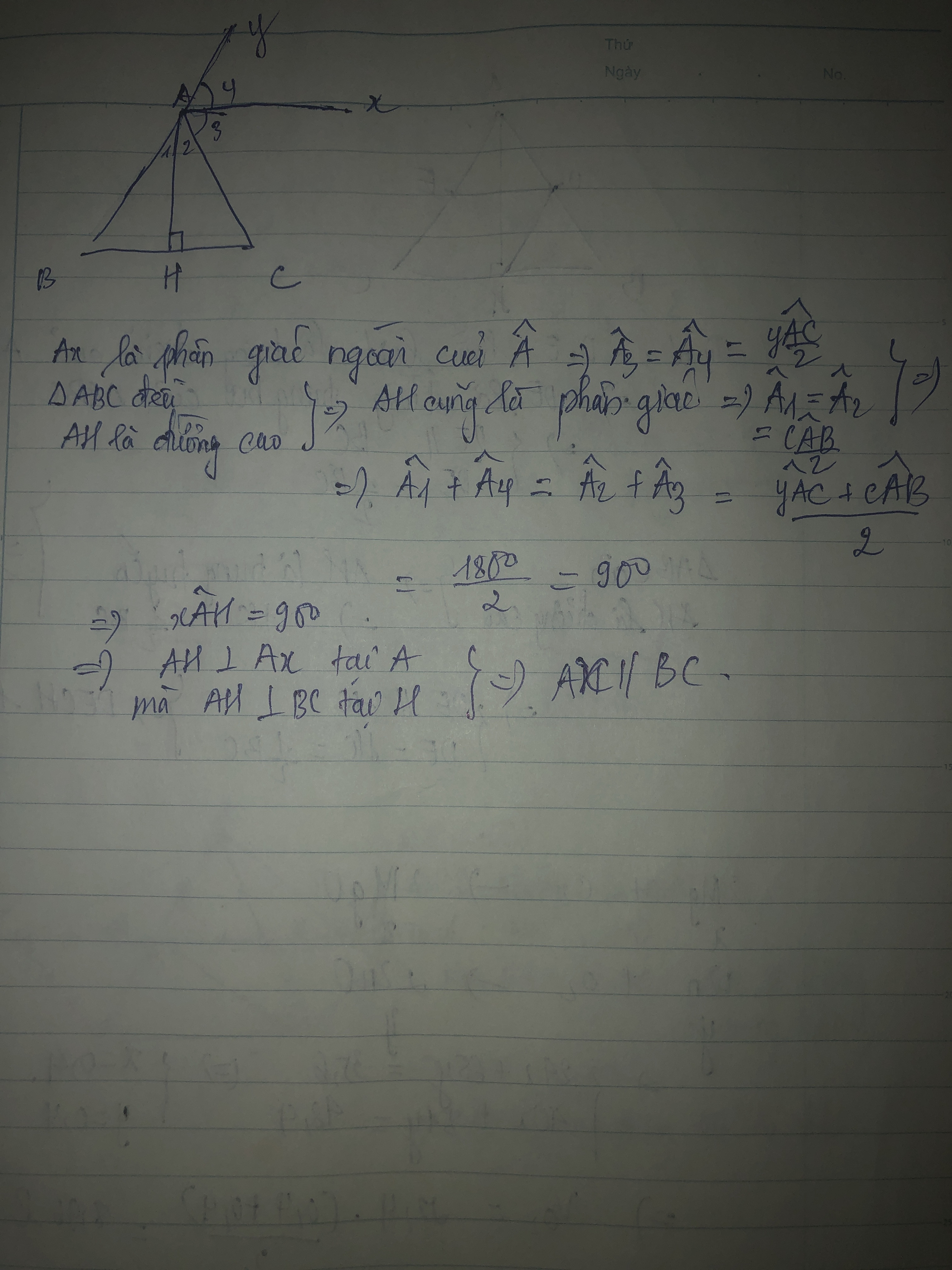 Cho tam giác ABC đều. Vẽ Ax là tia phân giác của góc ngoài tam giác tại đỉnh A. Vẽ đường