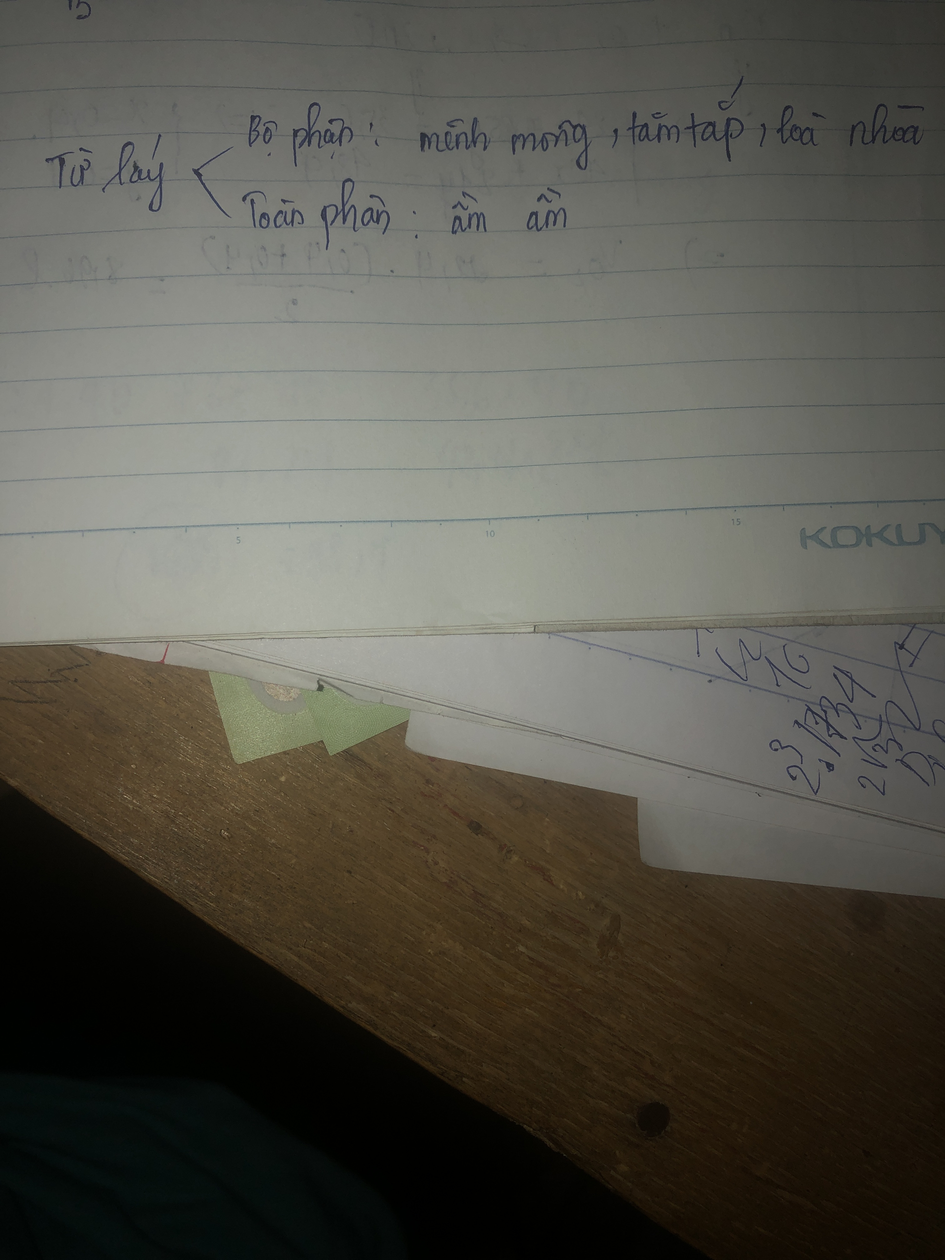 Thuyền chúng tôi chèo thoát qua kênh Bọ Mắt, đổ ra con sông Cửa Lớn, xuôi về Năm Căn. Dòng sông Năm Căn mênh mông, nước ầm ầm đổ ra biển ngày đêm như thác, cá nước bơi hàng đàn đen trũi nhô lên hụp xuống như người bơi ếch giữa những đầu sóng trắng. Thuyền xuôi giữa dòng con sông rộng hơn ngàn thước, trông hai bên bờ, rừng đước dựng lên cao ngất như hai dãy trường thành vô tận. Cây đước mọc dài theo bãi, theo từng lứa trái rụng, ngọn bằng tăm tắp, lớp này chồng lên lớp kia ôm lấy dòng sông, đắp từng bậc màu xanh lá mạ, màu xanh rêu, màu xanh chai lọ,... loà nhoà ẩn hiện trong sương mù và khói sóng ban mai.Tìm trong đoạn trích trên các từ láy, trong đó chia thành 2 nhóm (từ láy bộ phận và từ láy toàn phần).