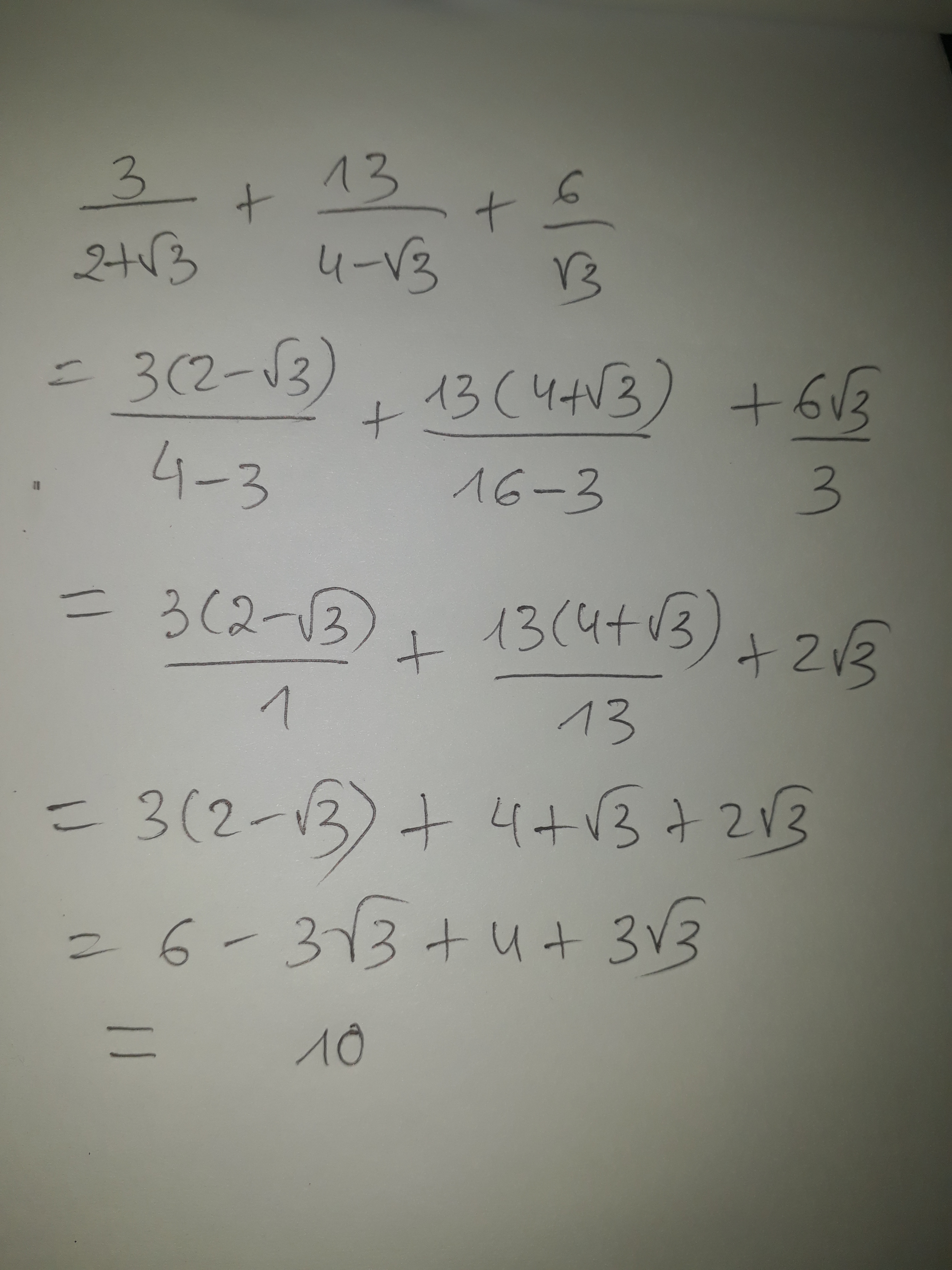 = \frac{{3(2 - \sqrt 3 )}}{{4 - 3}} + \frac{{13(4 + \sqrt 3 )}}{{16 - 3}} + \frac{{6\sqrt 3 }}{3}\\