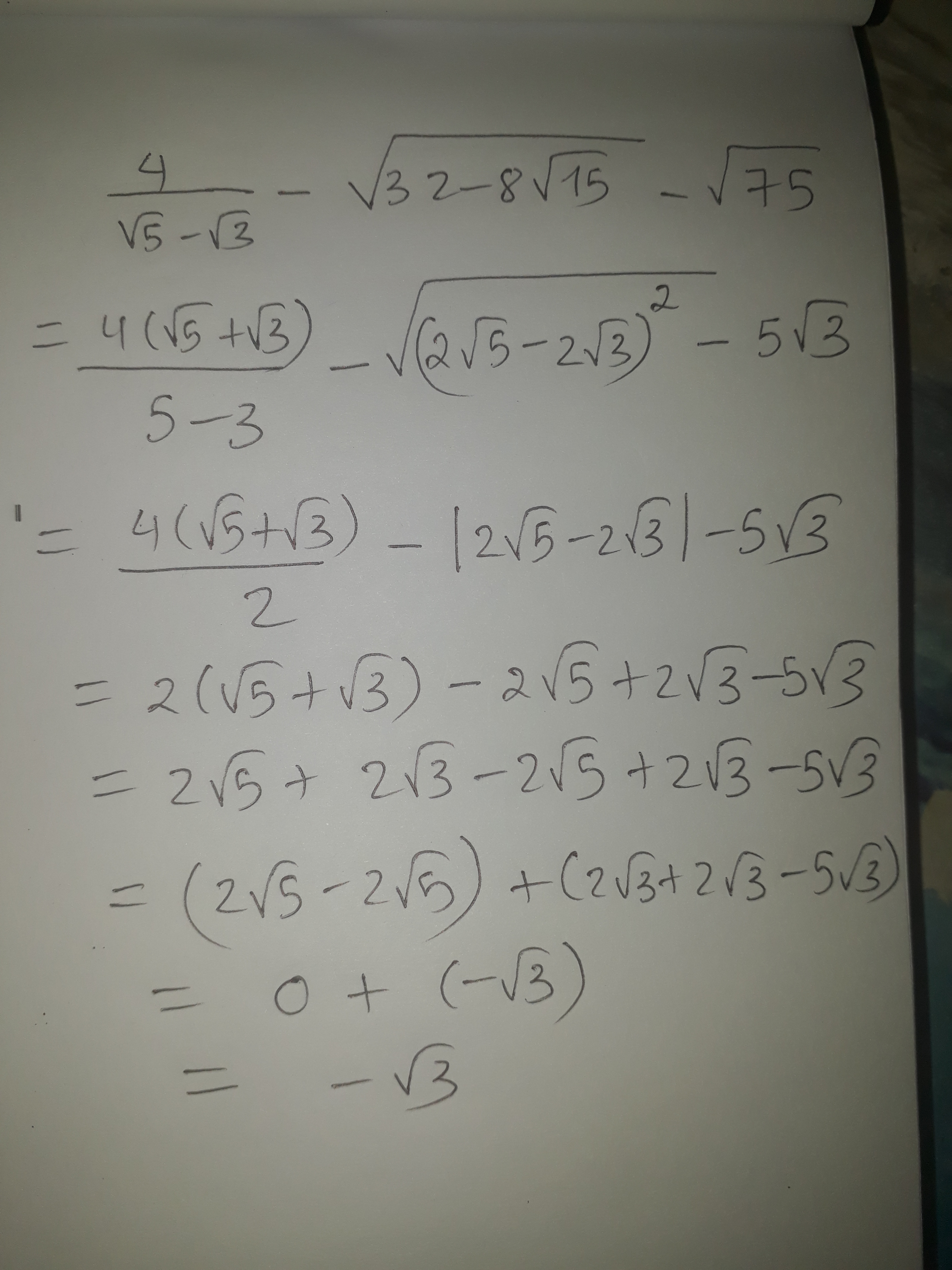 \frac{4}{{\sqrt 5 - \sqrt 3 }} + \sqrt {32 - 8\sqrt {15} } - \sqrt {75} \\