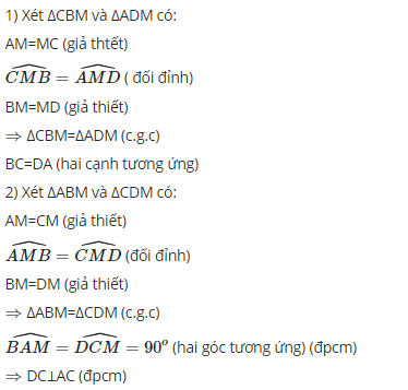 Cho tam giác ABC vuông tại A ,M là trung điểm của AC ,trên tia đối MB lấy điểm D sao cho MB=MD