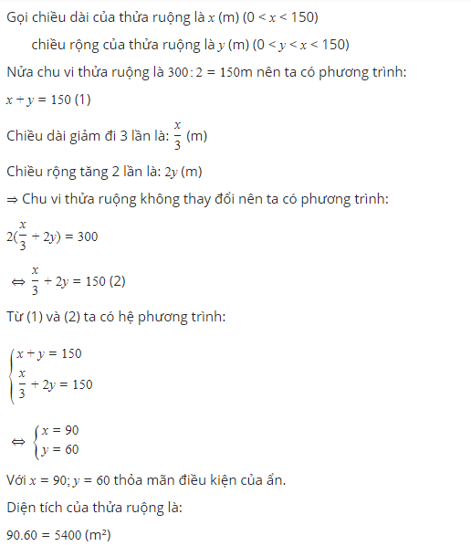 1 thửa ruộng hình chữ nhật có chu vi là 300m . Tính diện tích của thửa ruộng biết rằng nếu giảm chiều dài đi 3 lần và chiều rộng tăng 2 lần thì chu vi của thửa ruộng ko thay đổi ?