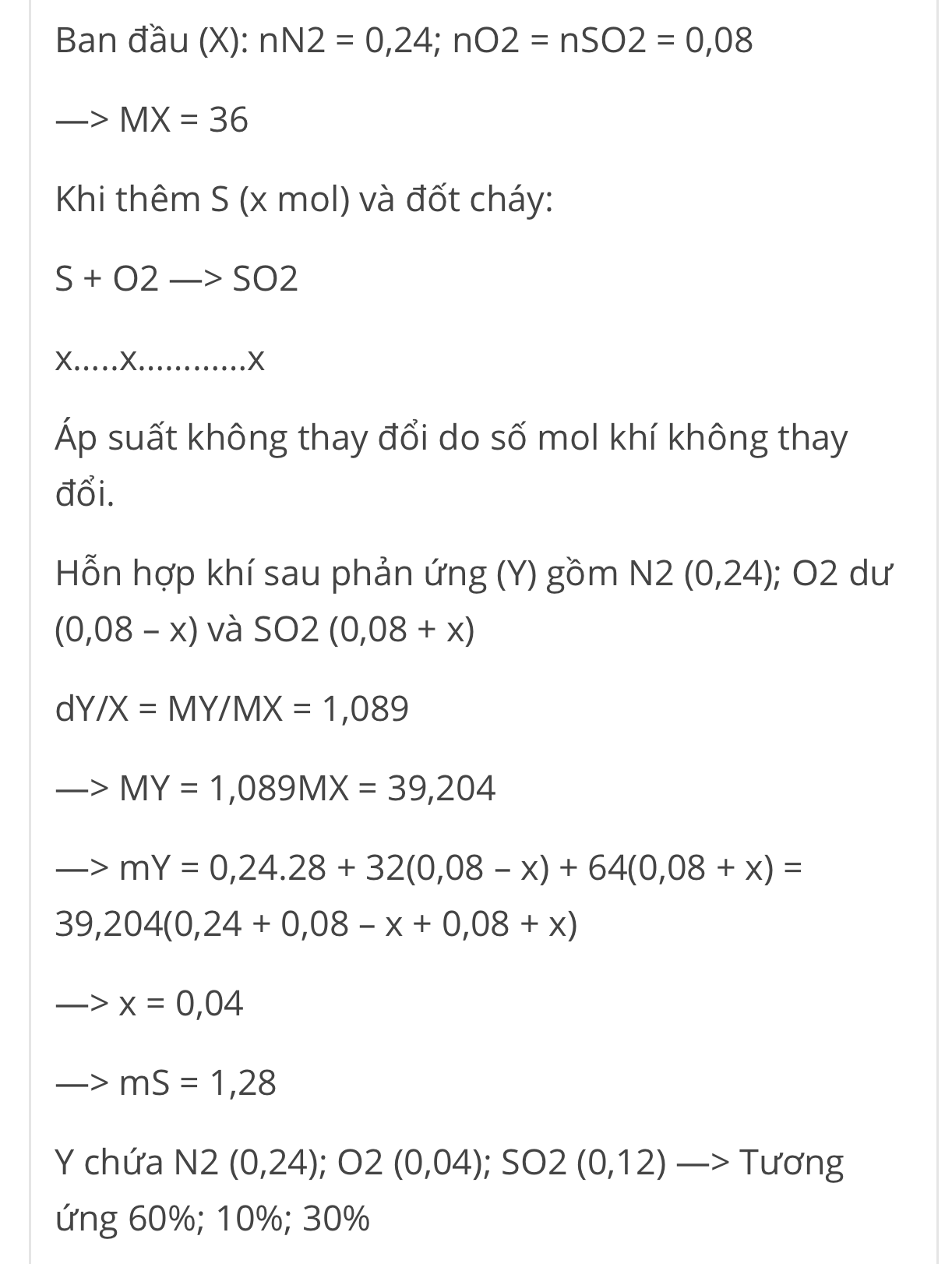 Một bình kín có dung tích 8,96 lít chứa đầy hỗn hợp X gồm N2,O2,SO2 theo tỉ lệ 3:1:1 mol ở đktc. Đốt cháy S trong X thu được hỗn hợp Y (sau khi đưa nhiệt độ bình về nhiệt độ ban đầu). Biết tỉ khối dY/X = 1,089