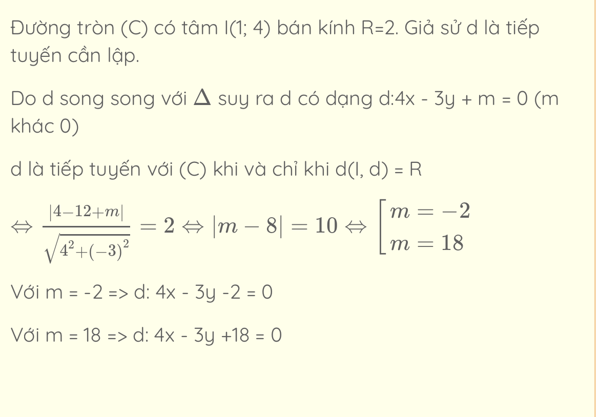 Trong mặt phẳng oxy, cho đường tròn (C): (x-1) mũ 2 + (y-4) mũ 2 =4. Viết phương trình tiếp tuyến với đường tròn (C) biết tiếp tuyến đó song song vơi đường thẳng 4x -3y + 2=0