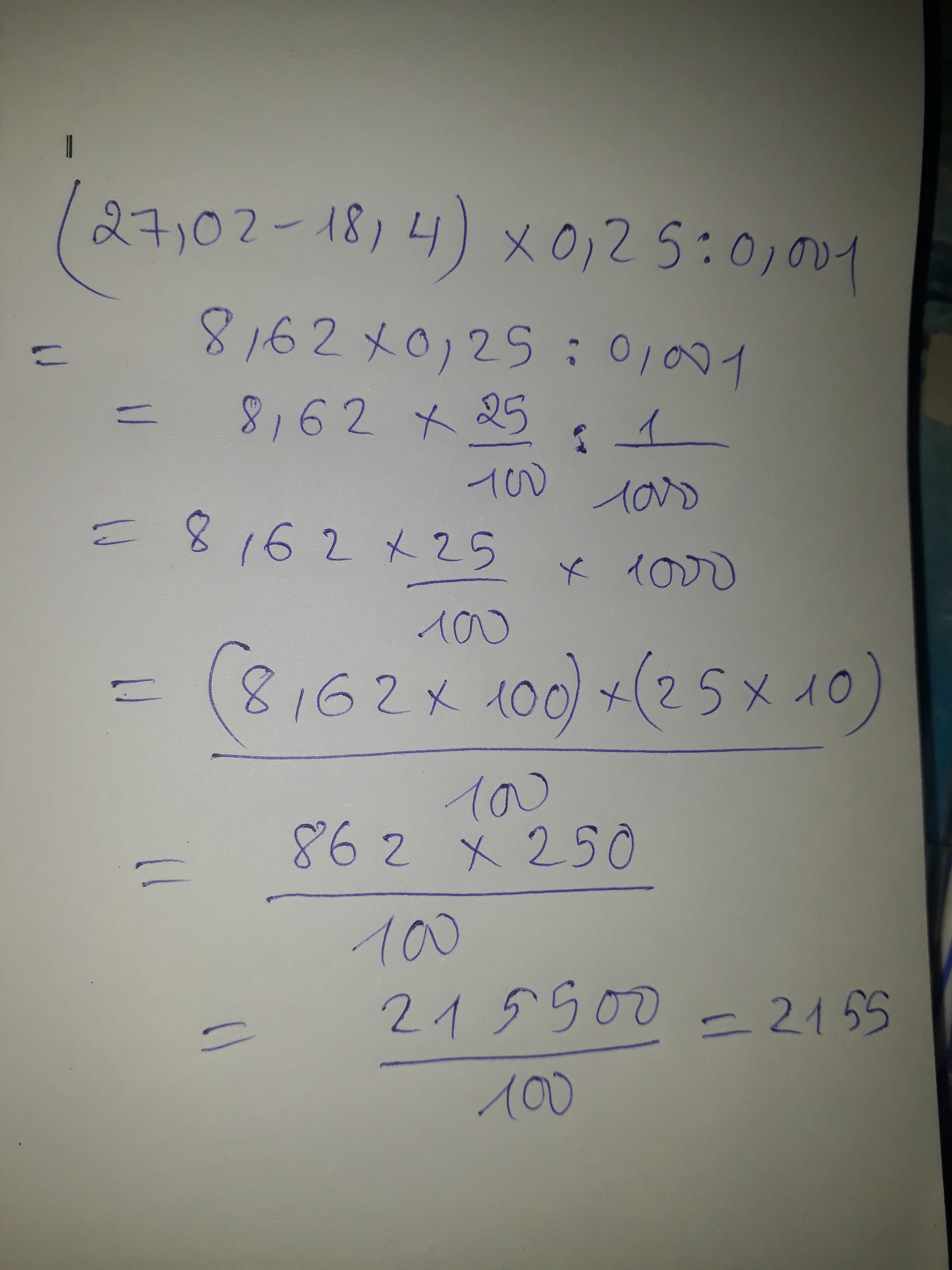 Tính giá trị biểu thức (27,02 - 18,4) × 0,25 ÷ 0,001