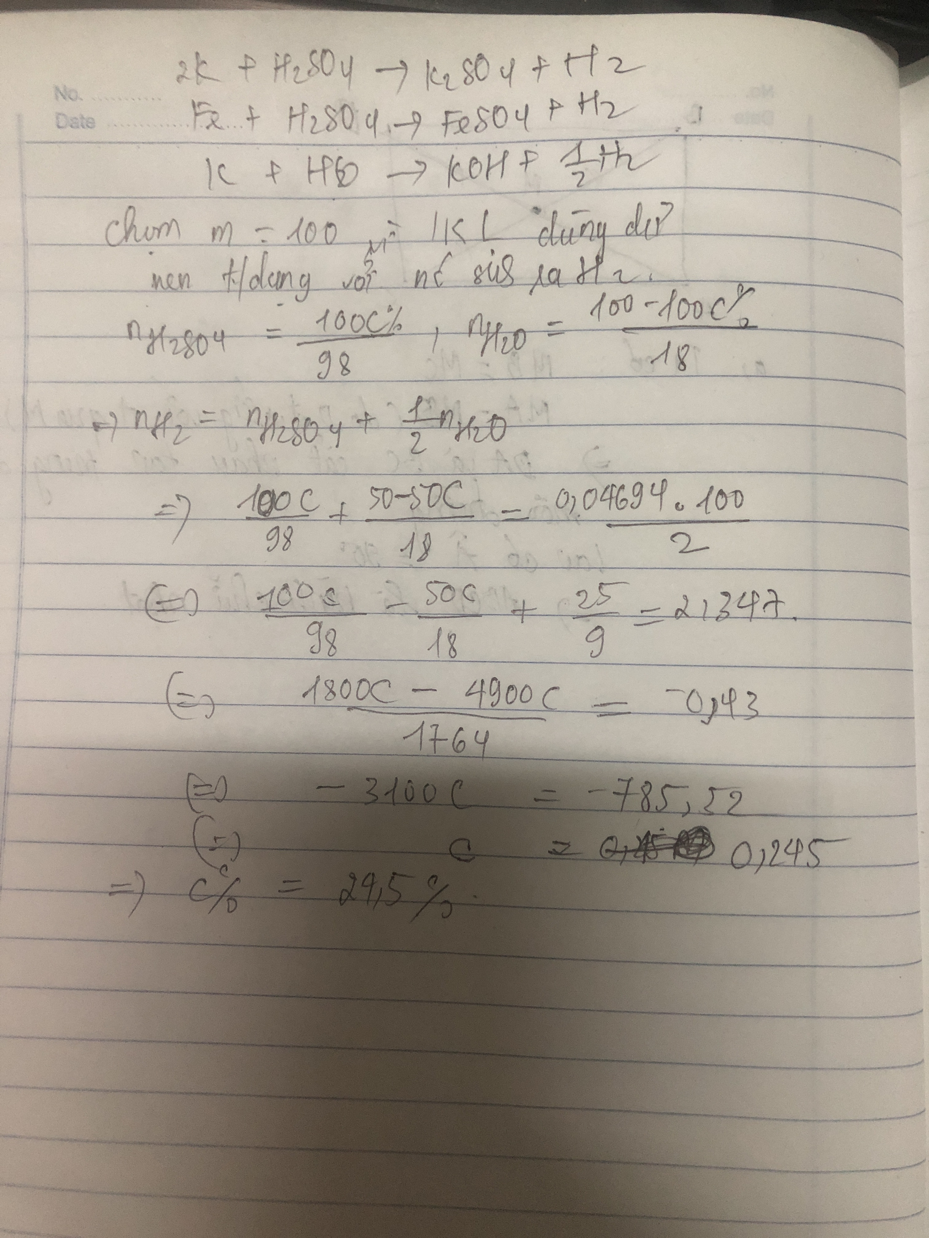 cho m gam dung dịch H2SO4 loãng nồng độ C% tác dụng hoàn toàn với hỗn hợp 2 ki loại kali và sắt(dư), sau p.ứng khối lượng chung đã giảm xuống 0,04694m gam. C% là: