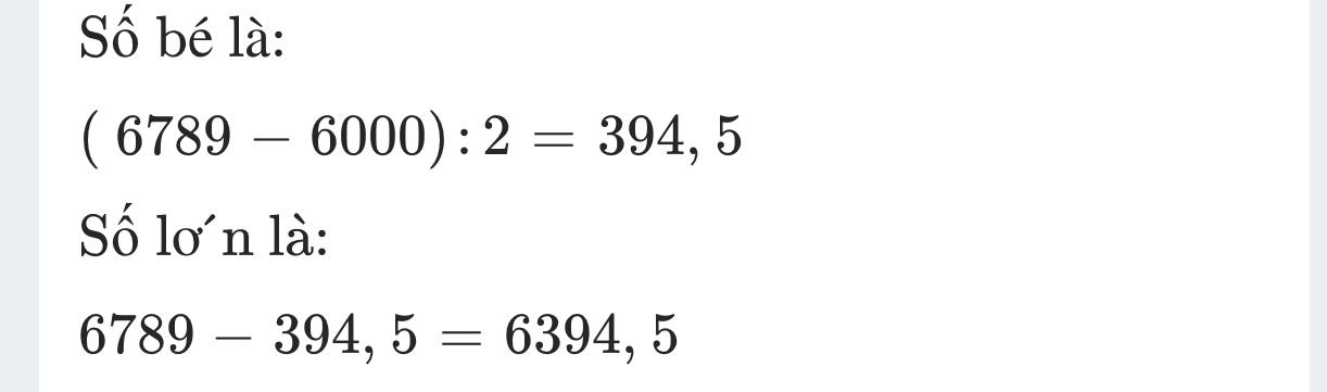 Tổng của hai số bằng 6789 nếu xóa chữ số sáu ở hàng cao nhất ở số lớn thì ta được số bé tìm hai số