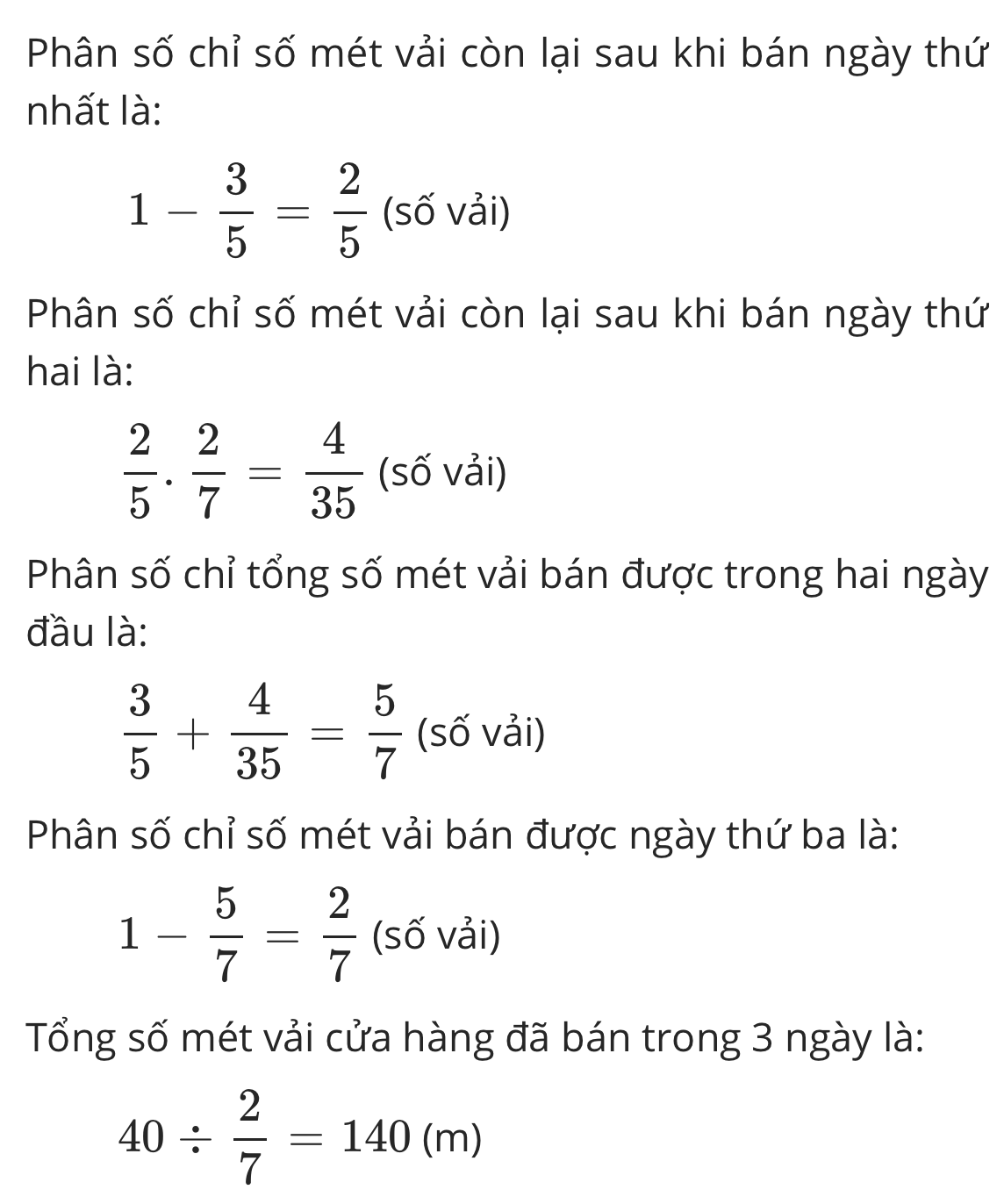 Một cửa hàng bán một số mét vải trong ba ngày. Ngày thứ nhất bán 3/5số mét vải. ngày thứ 2 bán 2/7 số mét vải còn lại. Ngày thứ 3 bán nốt 40m vải. Tính số mét vải cửa hàng đã bán.