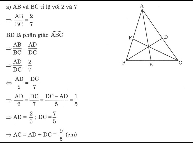 Cho tam giác ABC có các phân giác trong AE, BD, CF. Tính AC biết AB và AC tỉ lệ với 2 và 7, đồng thời DC - DA = 1 cm