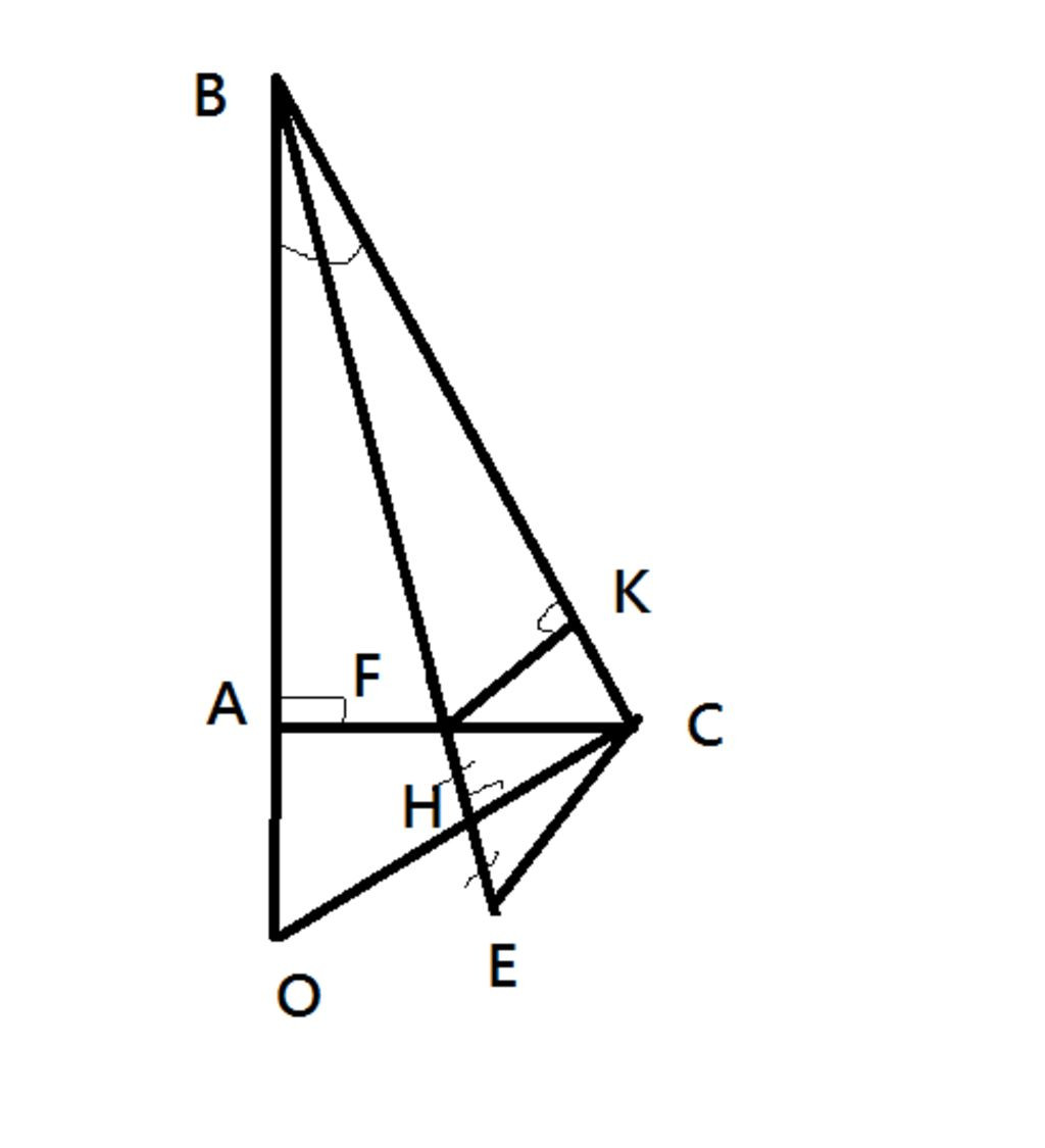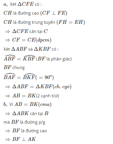 Cho tam giác ABC vuông tại A(AB>AC), kẻ pg BF(F€AC). Gọi H là hình chiếu của C trên tia BF, trên tia đối tia HB lấy điểm E sao cho HE=HF. Gọi K là hình chiếu của F trên BC.