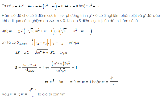 Tìm m để đồ thị hàm số y= có ba điểm cực trị là các đỉnh của một tam giác có bán kính đường tròn ngoại tiếp bằng 1