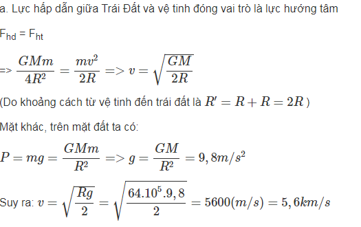 Một vệ tinh có khối lượng m = 60 kg đang bay trên quỹ đạo tròn quanh Trái Đất ở độ cao bằng bán kính Trái Đất. Biết Trái Đất có bán kính R = 6400 km. Lấy g = 9,8 m/s2. Tính tốc độ dài của vệ tinh.