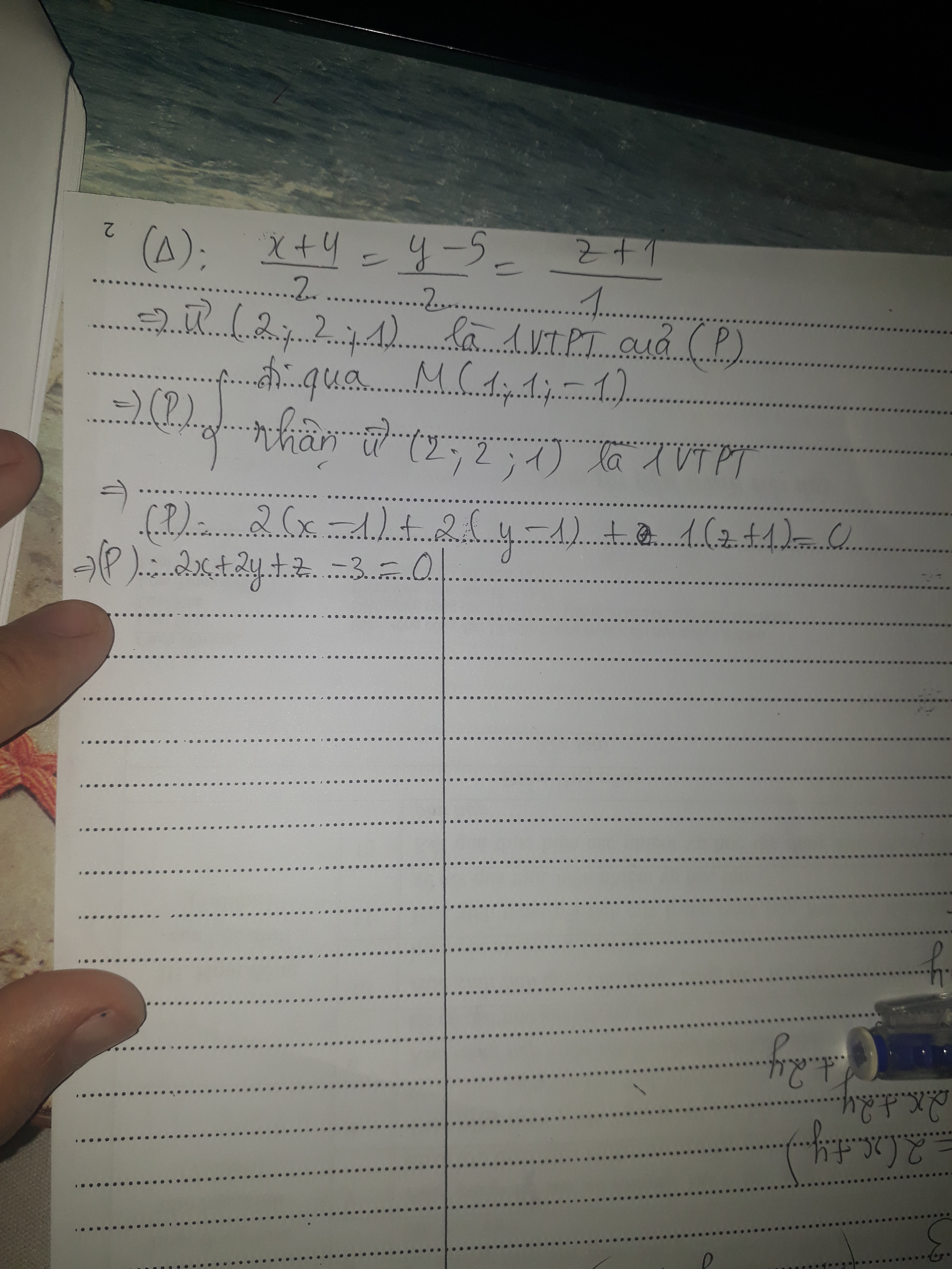 Trong kgoong gian Oxyz, mặt phẳng đi qua M(1;1;-1) và vuông góc với đường thẳng denta: có phương trình là: