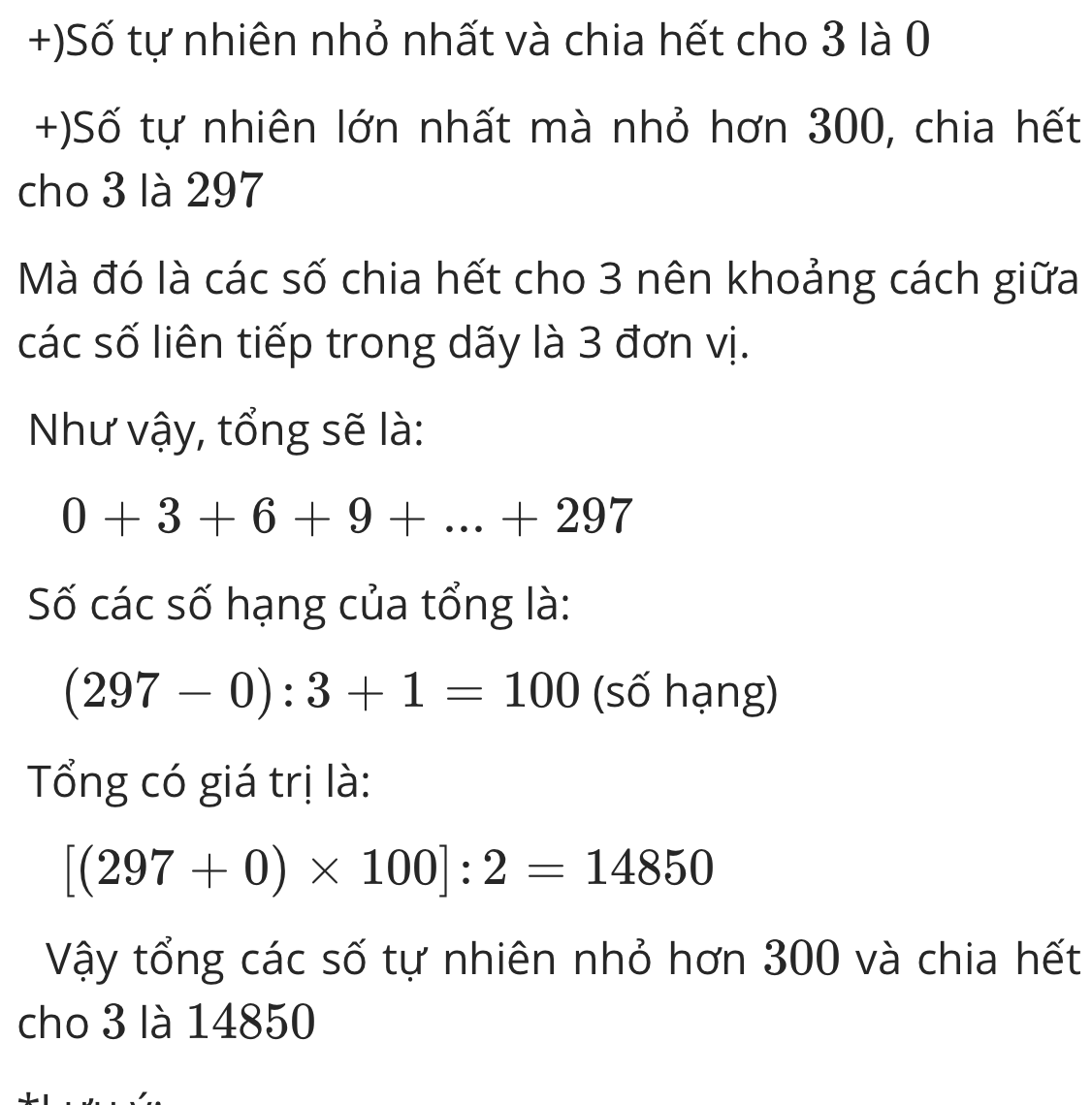 Tổng tất cả các số tự nhiên nhỏ hơn 300 mà chia hết cho 3 là: